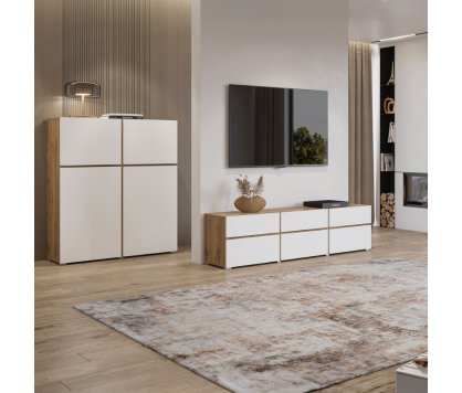 Available in three refined finishes – classic white, warm Wotan oak, and modern Congo – each piece is enhanced with onyx black edging, giving the collection a distinctive, sophisticated character. Whether you are furnishing your living room, dining area, or entertainment space, the CROSS Collection offers versatile solutions that combine style and practicality.