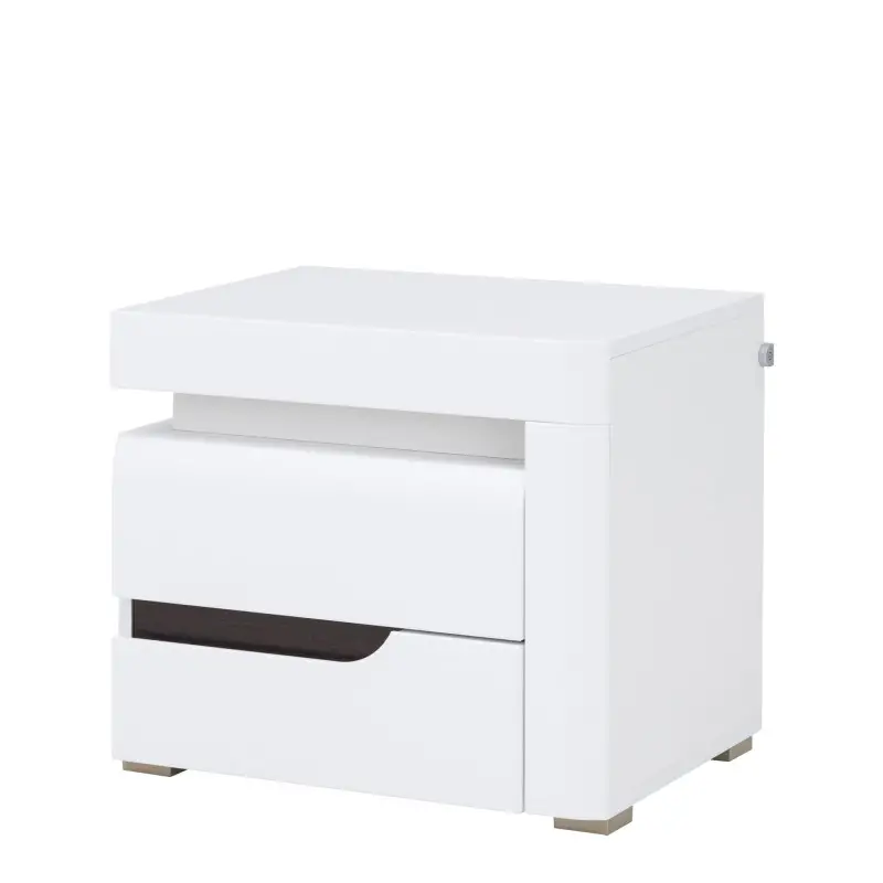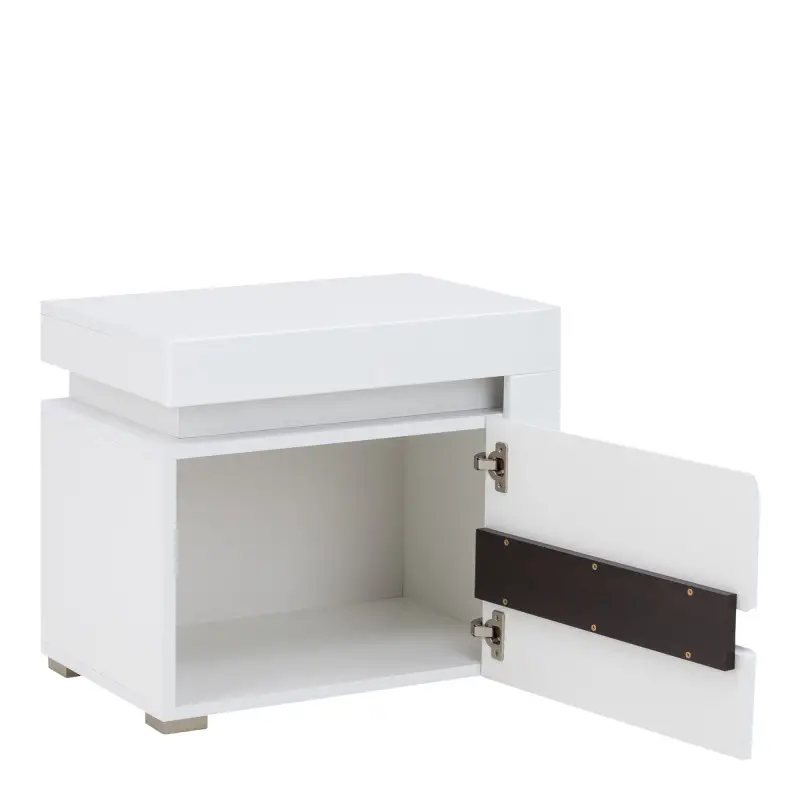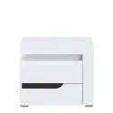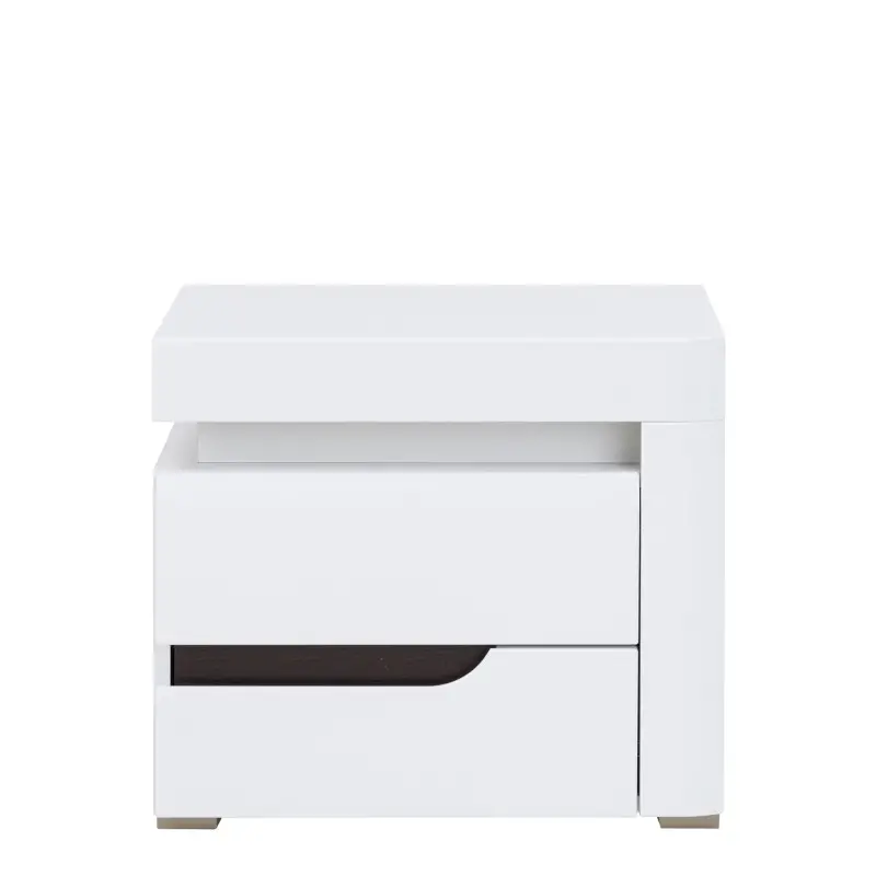 The modern milling design on the fronts replaces traditional handles, adding a sleek, contemporary touch to this White Bedside Table. The blend of matte and glossy white finishes aligns with current interior design trends in Ireland, bringing a fresh and elegant look to your bedroom. Pair it with other items from the IRMA furniture collection or use it as a standalone piece.
