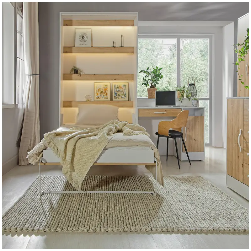 With its sleek white finish and vertical opening mechanism, the Perfect- Vertical Wall Bed Oak 120cm blends seamlessly into any contemporary interior. Easy to operate and built for everyday use, it transforms from a comfortable bed at night into a stylish piece of furniture during the day, freeing up valuable floor space.