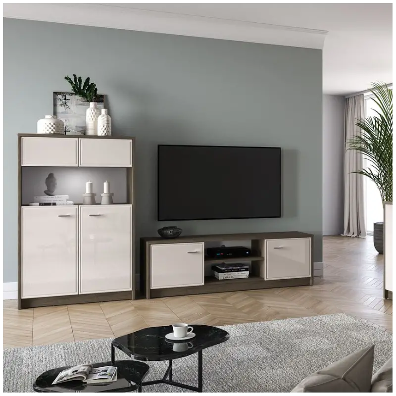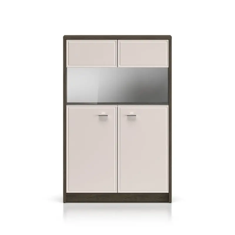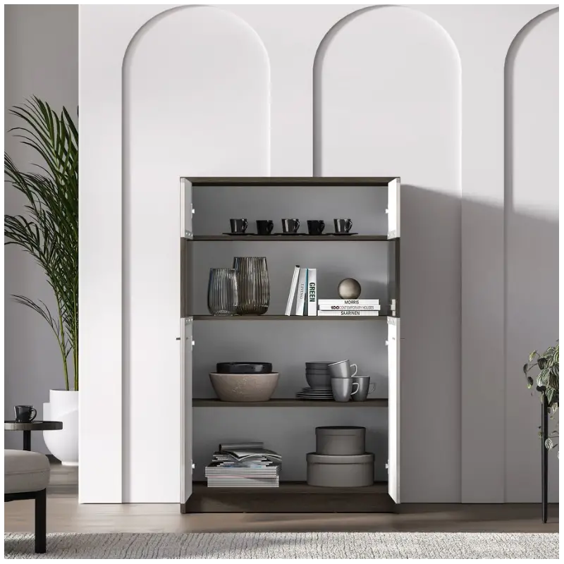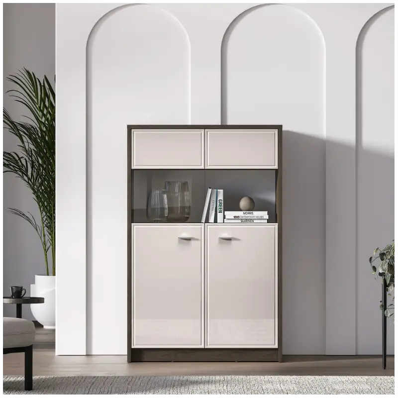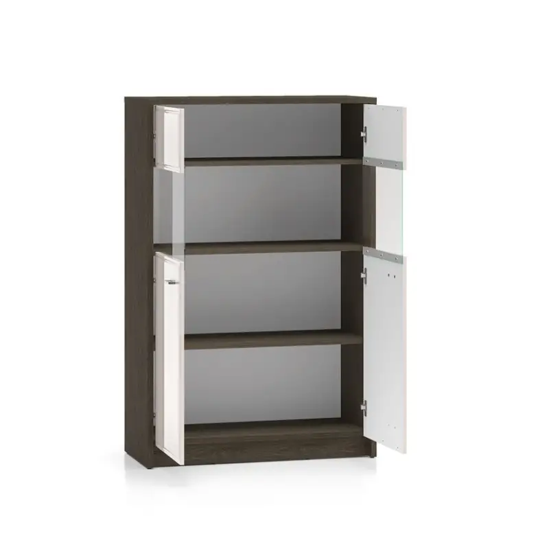 - Multi-Zone Storage: Hidden lower compartments, glass display section, and enclosed upper storage.