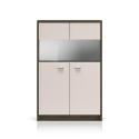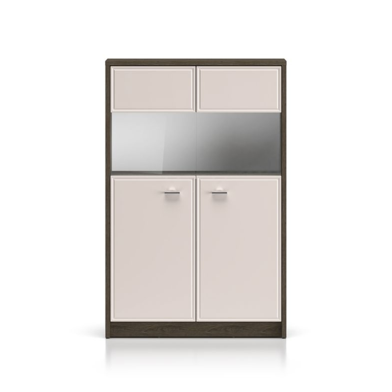 The lower section of the cabinet features two spacious compartments hidden behind closed doors – ideal for storing tablecloths, towels, or other everyday essentials out of sight. The central section, enclosed with stylish glass doors, is perfect for displaying porcelain cups, decorative glassware, or a sophisticated dinner set. The top section offers another enclosed compartment, making it the ideal place for documents or home textiles.