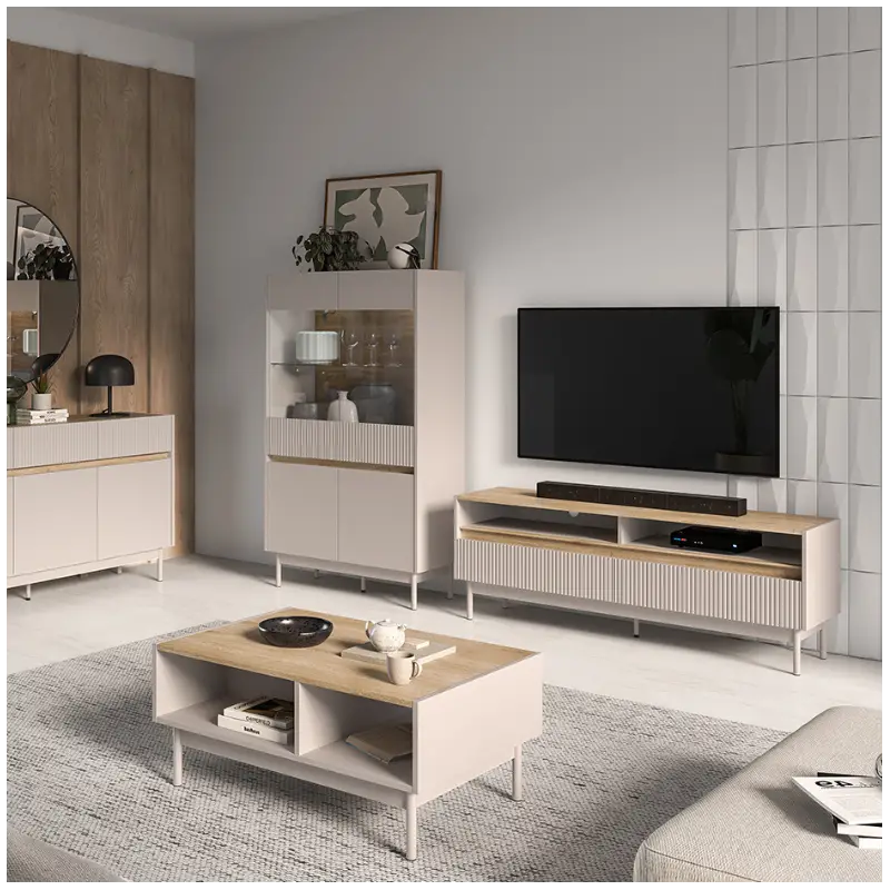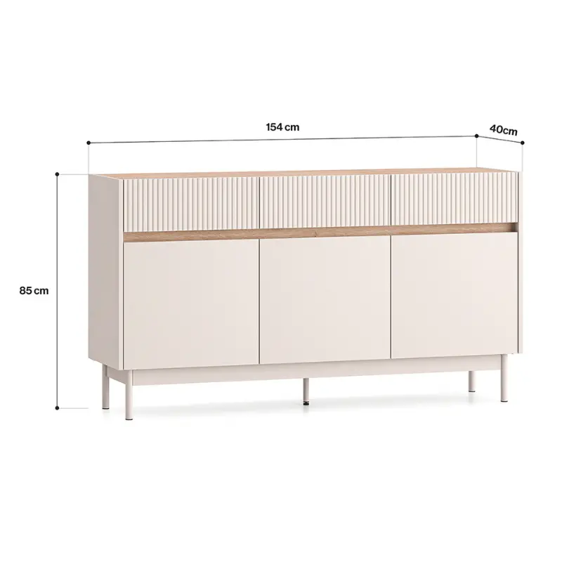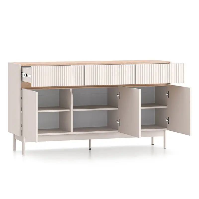 The Dunea Sideboard Cashmere and Oak with 3 doors and 1 drawer is the ideal solution for stylish and practical home storage. This large cabinet features six spacious compartments behind its triple doors, perfect for organizing clothes, towels, or tableware. The top section includes a drawer, perfect for documents, home textiles, or smaller household items.