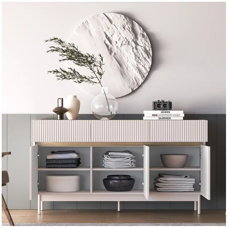 The wide top surface provides an excellent space to display elegant vases, decorative items, or travel souvenirs, making it both functional and stylish. Keep your living space tidy and elegant with the Dunea 05 Sideboard.