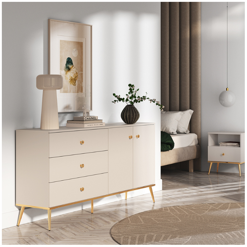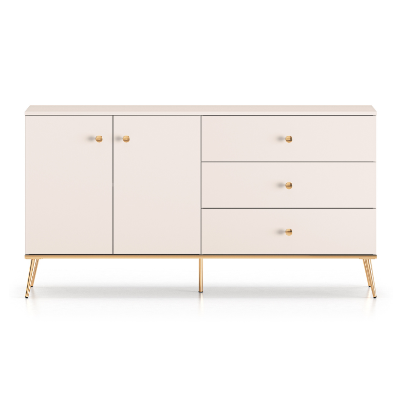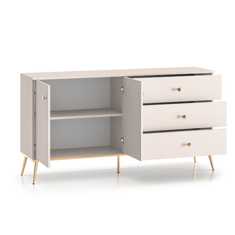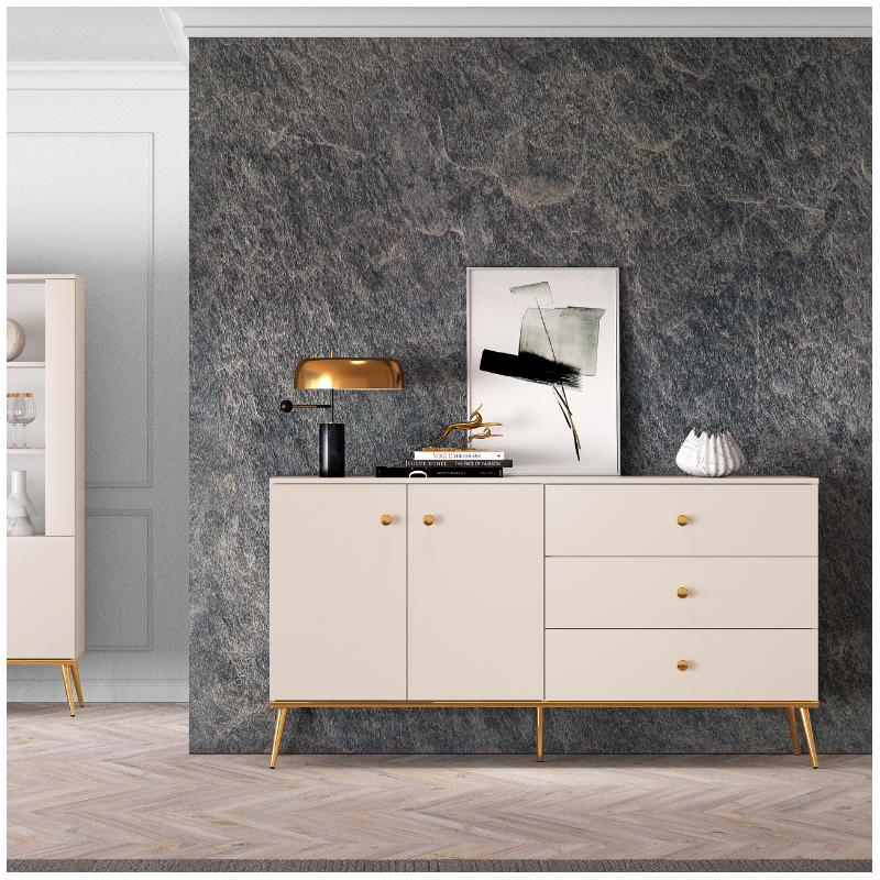 With a wide top surface, this sideboard is perfect for showcasing elegant vases, travel souvenirs, or your favorite decorative items. The cabinet is set on sturdy, high metal legs for stability and durability. Double-plated handles and gold-finished legs ensure long-lasting, comfortable use. Selgin furniture combines high functionality with stunning, contemporary design, making it a stylish addition to your living room or bedroom.