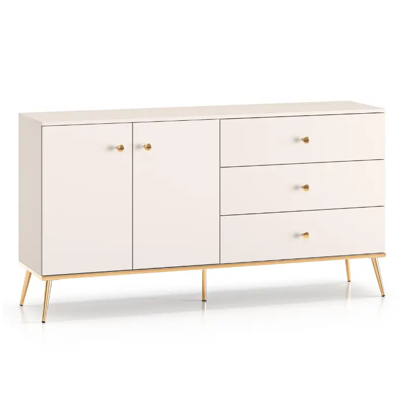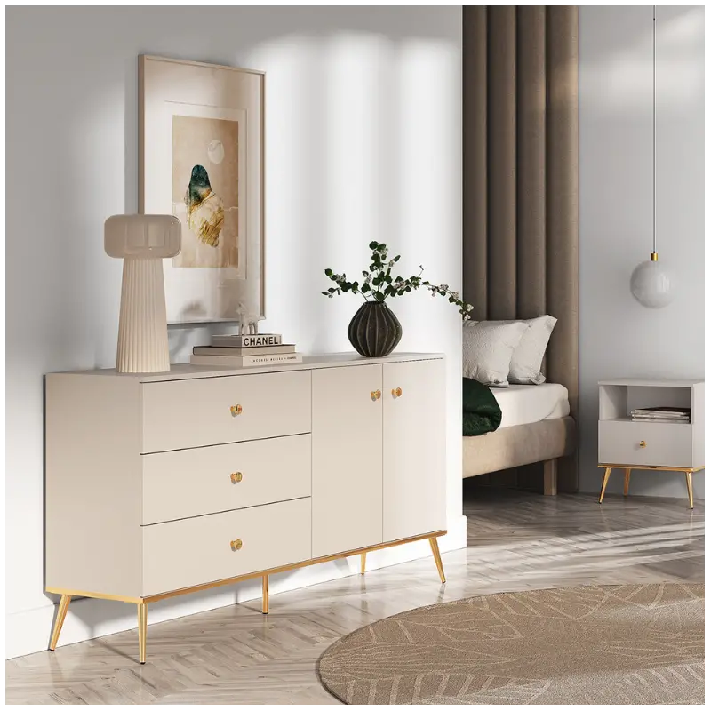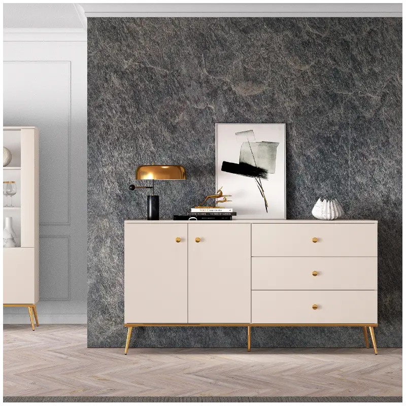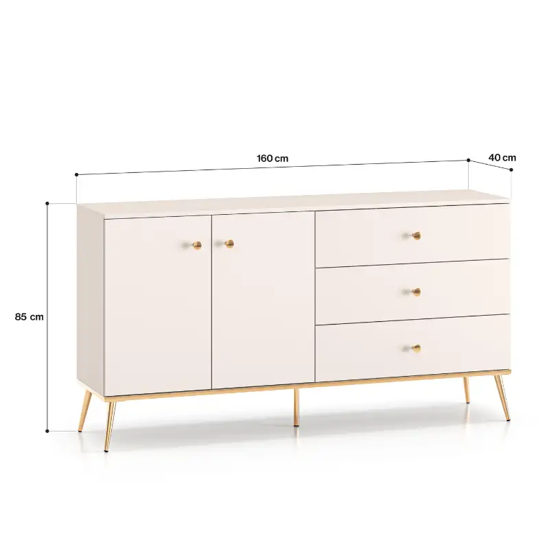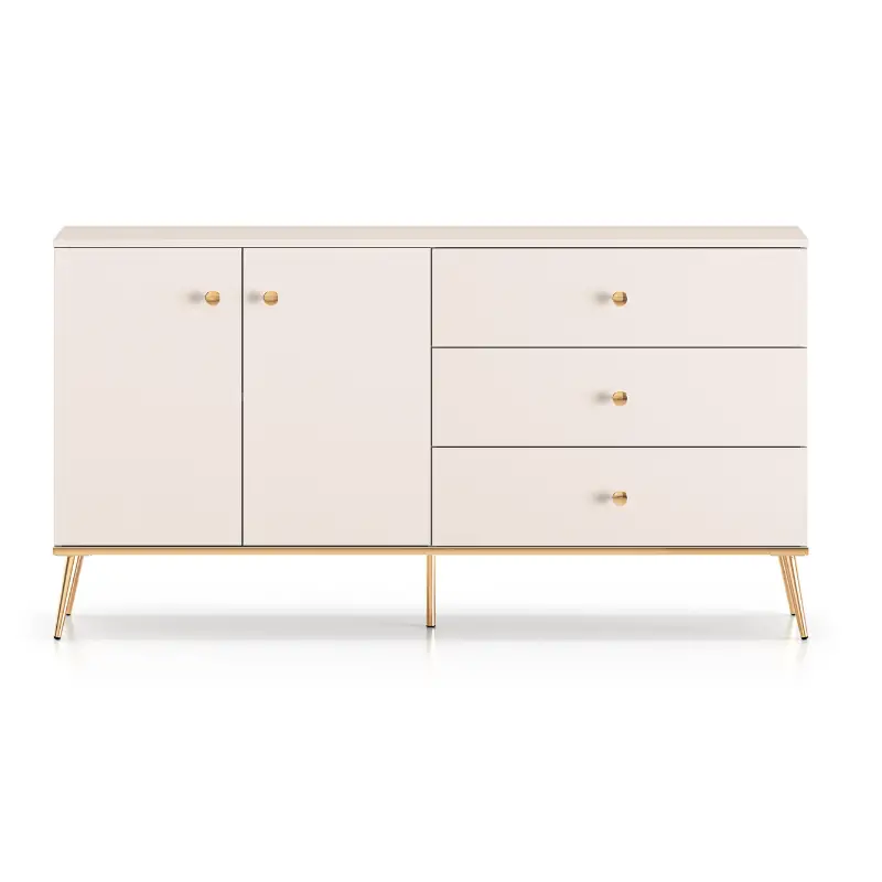 With a wide top surface, this sideboard is perfect for showcasing elegant vases, travel souvenirs, or your favorite decorative items. The cabinet is set on sturdy, high metal legs for stability and durability. Double-plated handles and gold-finished legs ensure long-lasting, comfortable use. Selgin furniture combines high functionality with stunning, contemporary design, making it a stylish addition to your living room or bedroom.