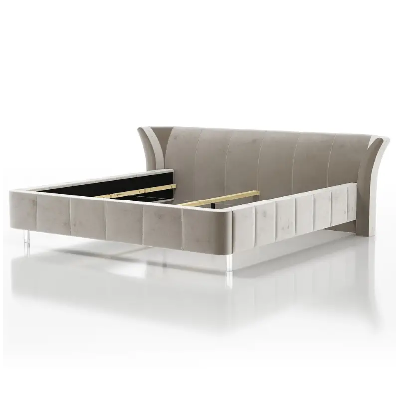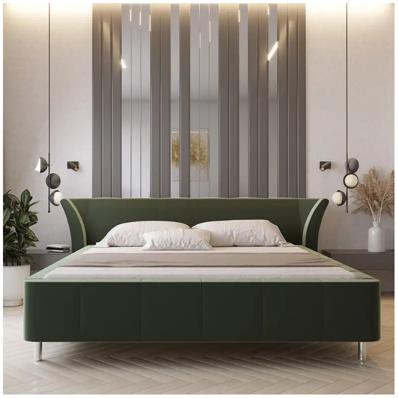The elegant yet simple structure, enhanced by refined vertical stitching, creates a striking statement in spacious bedrooms. Constructed from high-quality board and upholstered in luxurious fabric, this bed stands securely on silver plastic legs. For a more classic, upscale touch, optional wooden supports are available in black or brown finishes.