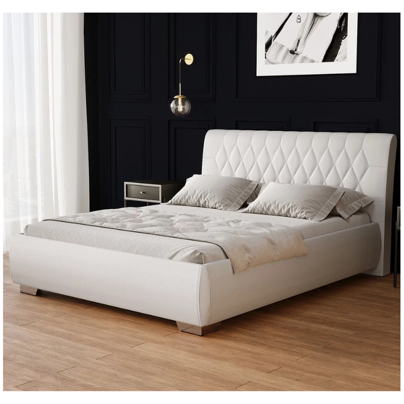 Its refined yet minimalist structure, enhanced by precise vertical stitching, makes a striking statement in larger bedrooms. Built from durable high-quality board and upholstered in luxurious fabrics, this bed rests securely on silver plastic legs. For a more classic touch, optional wooden legs are available in black or brown finishes.