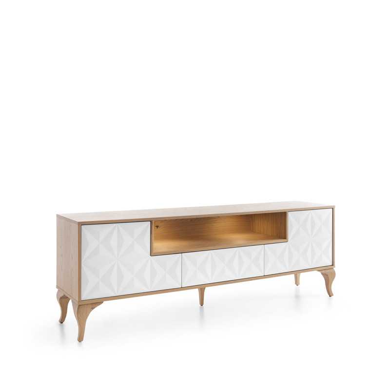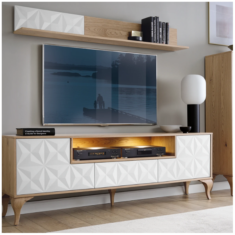 Elevate your living room with this modern TV unit featuring a striking diamond design in a stylish white and oak finish. Combining sleek lines with elegant detailing, this unit is perfect for contemporary interiors, offering both beauty and practicality. Designed to hold your TV securely while providing ample storage, it keeps your media essentials organized and your space clutter-free.