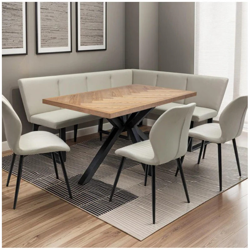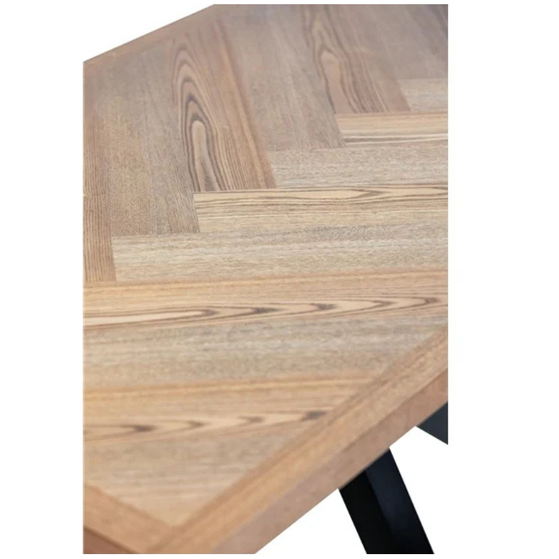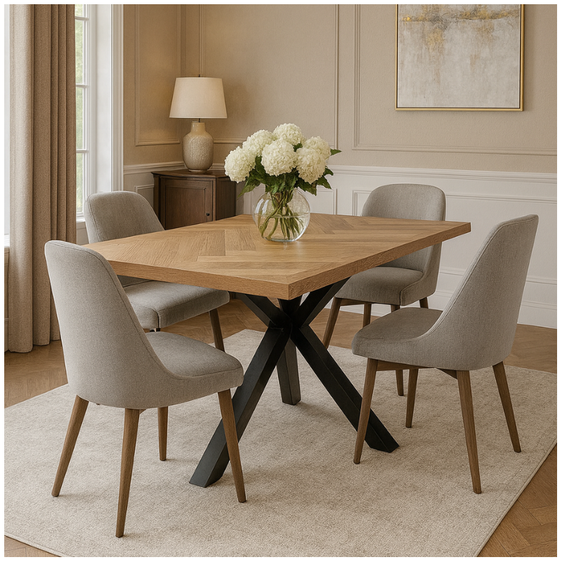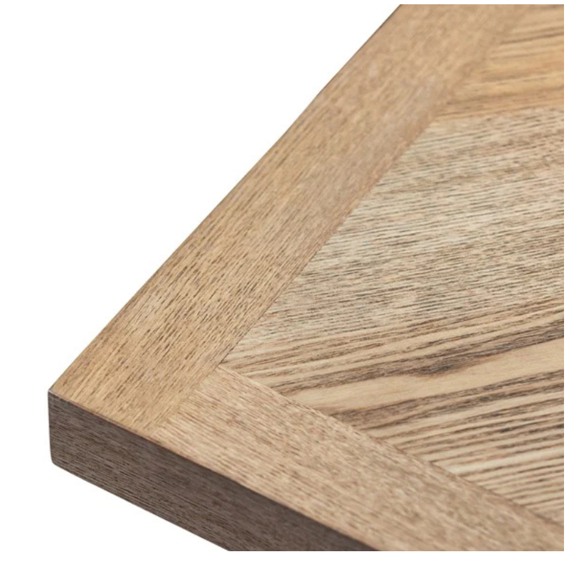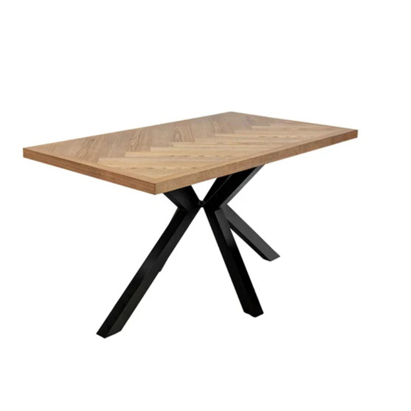 Add a modern touch to your dining room with the Zara Medium Ash Veneer Fixed Dining Table. Featuring a herringbone top inlay crafted from ash veneer, this dining table combines elegance and durability. The black metal X-frame base adds a contemporary industrial feel, making it a stylish centerpiece for any dining space.