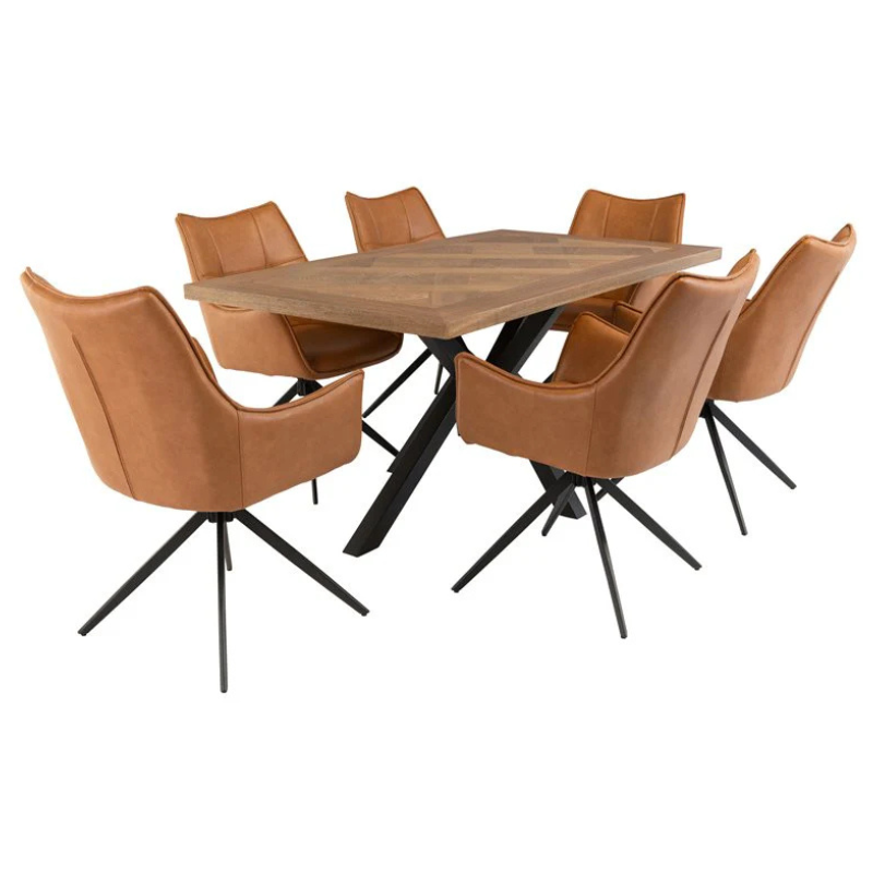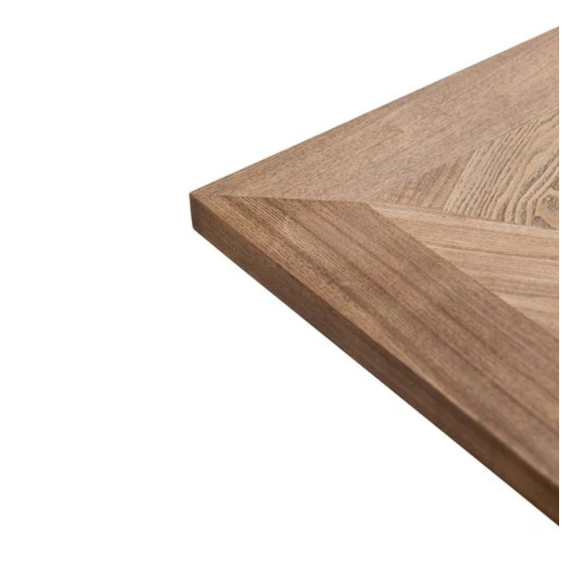 Bring elegance and contemporary style to your dining room with the Hugo Fixed Dining Table. Featuring a detailed inlay design and a sturdy black metal X-frame support, this dining table is crafted with a medium oak veneered finish for a timeless look.