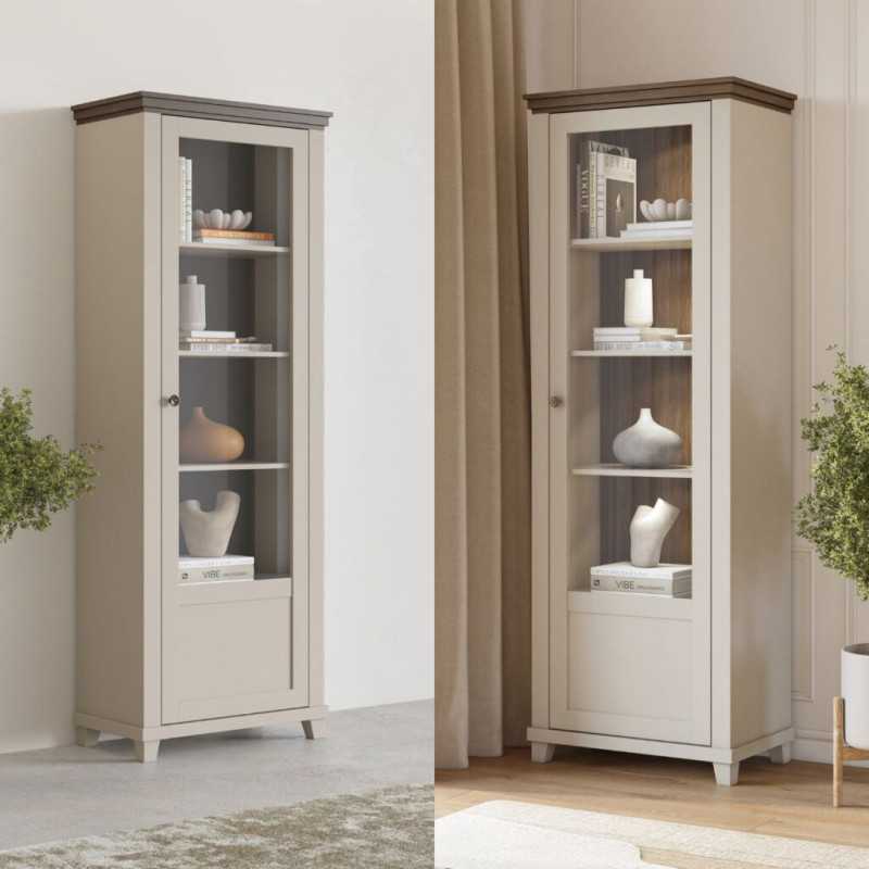 The Eva Light Beige Right Display Cabinet features a stunning glass-paneled door with four display shelves for ornaments, glassware, or decorative items. One lower hidden shelf provides additional storage, keeping your space tidy and organized. This wooden display cabinet combines elegance and practicality, making it a must-have for homes across Ireland.