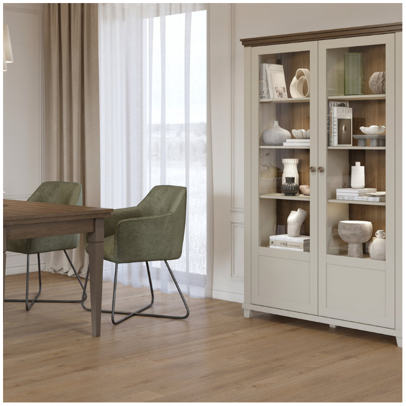 The Eva Display Cabinet is the ideal choice for anyone looking to add elegance and functionality to their home. With its bright light beige finish paired with traditional light wood, this light beige display cabinet brings a fresh and airy feel to any interior. Perfect for living rooms, dining rooms, kitchens, or hallways, it combines classic design with modern practicality. Eva Display Cabinet – stylish light beige & wooden cabinet with glass doors and drawers. Perfect display cabinet Ireland for living room, dining, or kitchen.