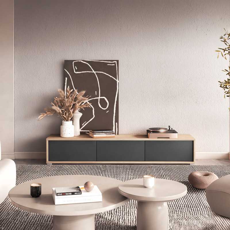 Available in three configurations—including a spacious 3-door version—and a selection of elegant colour finishes such as Oiled Oak and Anthracite. The Frida 3-door TV unit in Anthracite Finish offers a bold, modern look with a deep, rich tone that complements both light and dark interiors. The matte anthracite surface adds a sophisticated industrial edge, ideal for those seeking a clean yet dramatic focal point in their living room.