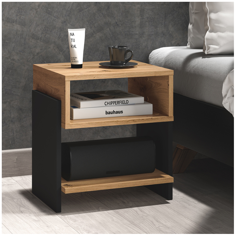 Complete your bedroom with the stylish Tris Bedside Table – a perfect companion for modern and loft-inspired interiors. Designed in a striking combination of Artisan Oak and Black, this bedside table adds a touch of industrial elegance while offering practical everyday functionality.
