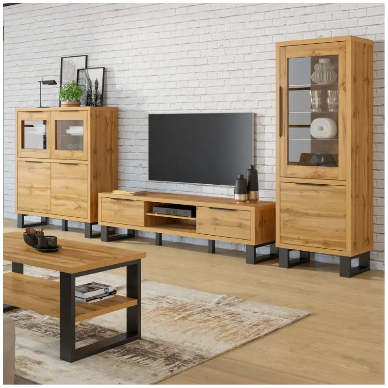 This striking display unit features a harmonious duet of natural wood tones and cool metal finishes. The front is crafted in warm wotan oak, showcasing a clear and expressive grain pattern that adds texture and visual depth. The collection also offers a sophisticated alternative — the new, darker wallace oak — perfect for modern interiors seeking a bold, dramatic effect.