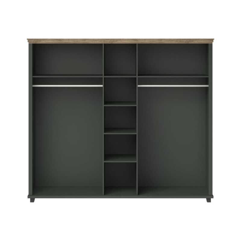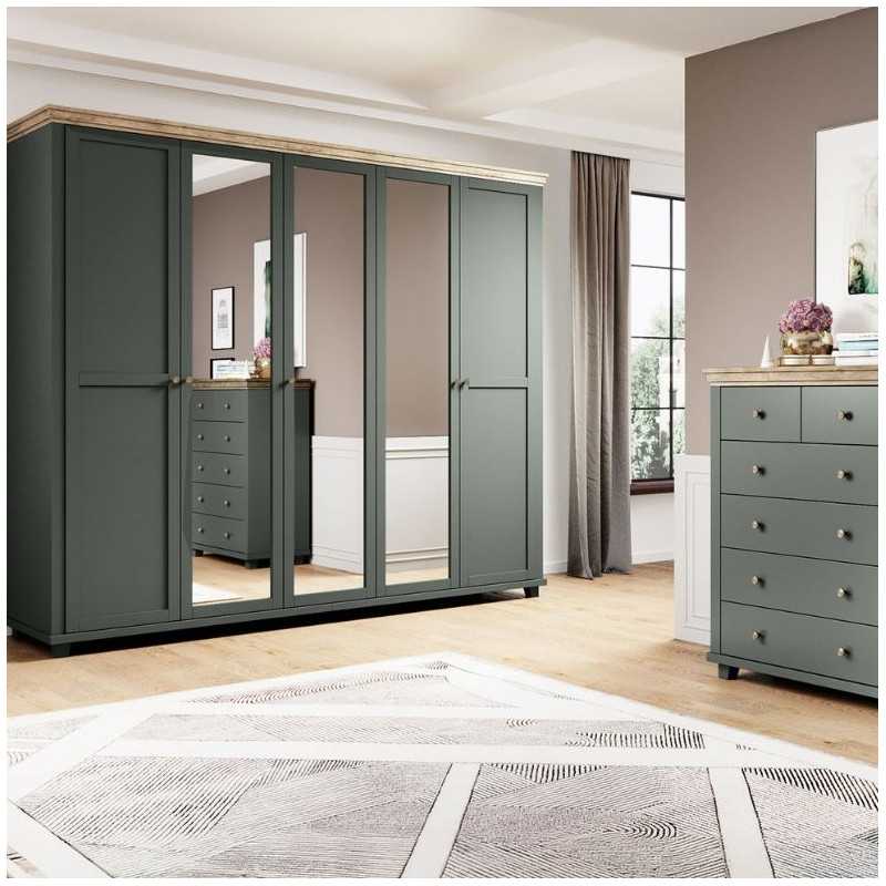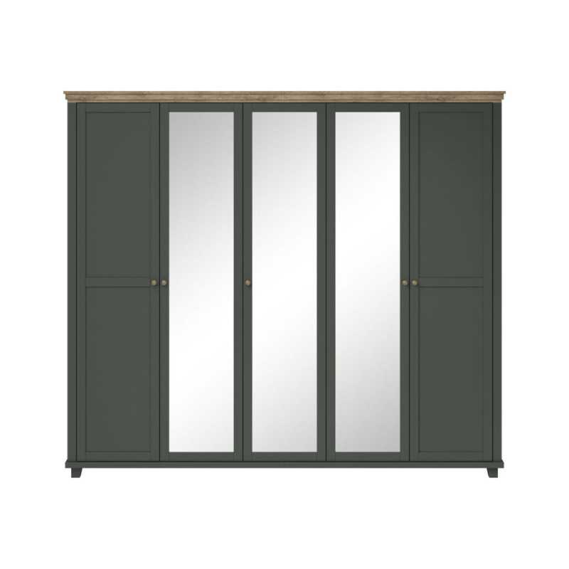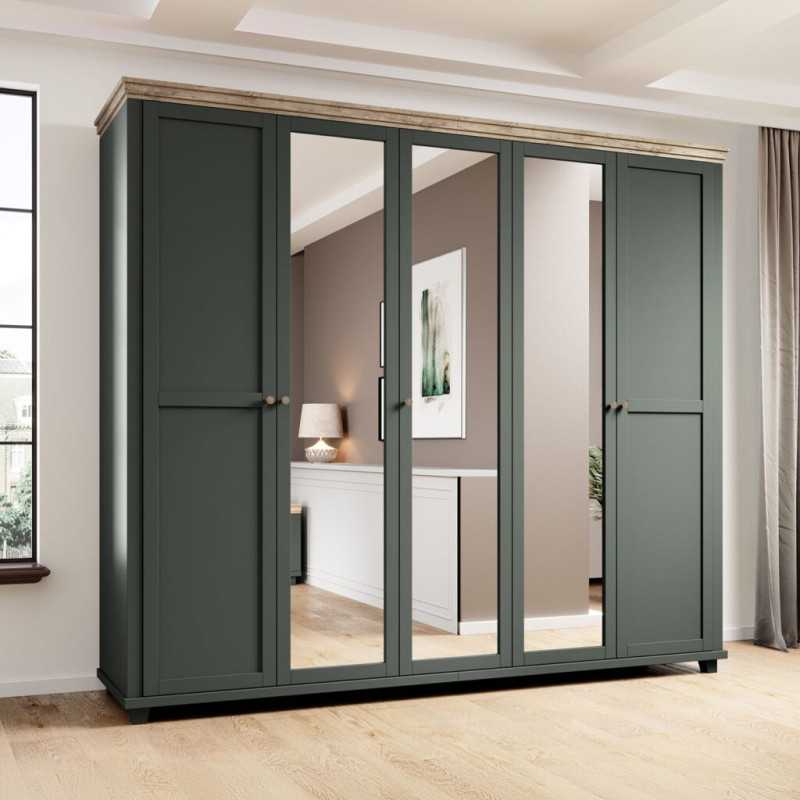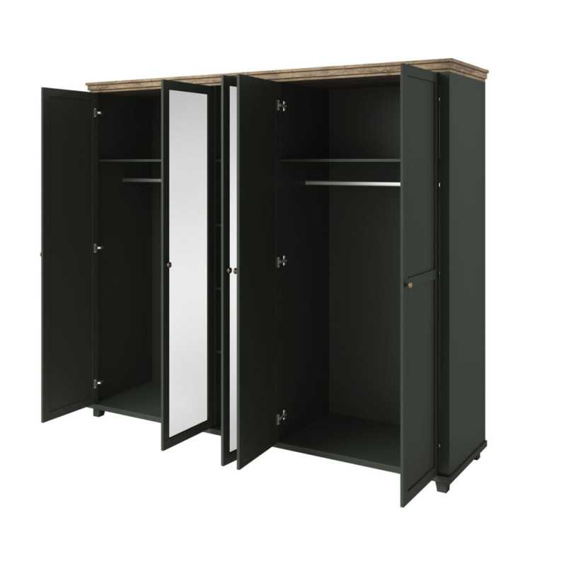 The EVA wardrobe is an elegant and modern bedroom solution that perfectly balances functionality with refined style. Its distinctive feature is the unique combination of deep green and the natural tone of Lefkas oak, bringing warmth and sophistication to any interior. This stunning 5 door wardrobe with mirror is designed to offer maximum storage while enhancing the visual appeal of your bedroom.