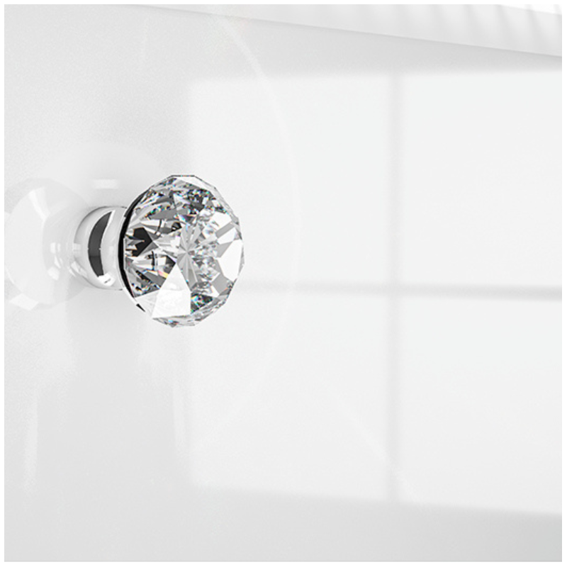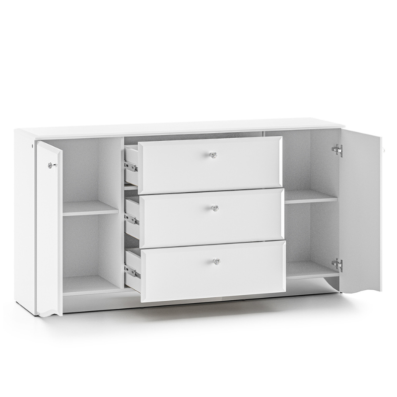 The luxurious character of this sideboard is enhanced by touch-sensitive LED lighting, which adds an original and atmospheric glow to your space. The comfortable silent-closing hinges ensure a smooth experience every time you open or close the drawers. The chrome handles with imitation diamond accents complete the look, creating a magical light-diffusing effect.