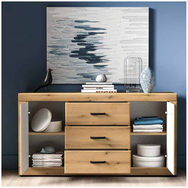 The combination of warm oak tones and the smooth finish of the Evoke Oak veneer ensures this sideboard enhances your home’s decor with a sophisticated look. The spacious drawers are ideal for organizing tableware, linens, or other items, keeping your space neat and tidy while contributing to the timeless beauty of your home.