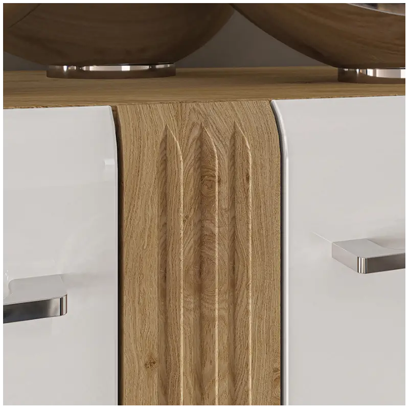 With its glazed and illuminated display sections, this cabinet adds a soft, ambient glow, creating a unique atmosphere in any room. The stylish grooved inserts, finished in the same warm shade as the main body, offer a touch of texture, while the rounded upward edges of the fronts break the straight lines of the collection, weaving a blend of classic and contemporary design elements.