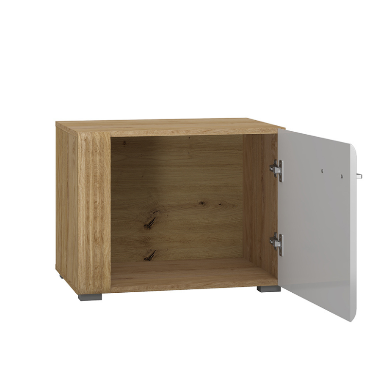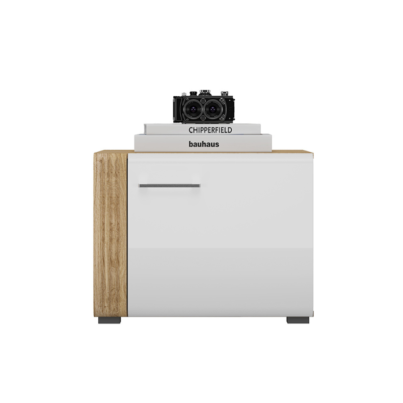 The Adagio bedside table brings sophistication and practicality to your bedroom. Its elegant design features white fronts paired with a natural-toned main body, making it ideal for both modern and classic interior styles. The smooth surface and metal handles of the bedside table not only enhance its visual appeal but also reflect light, helping to create a sense of space in your room.