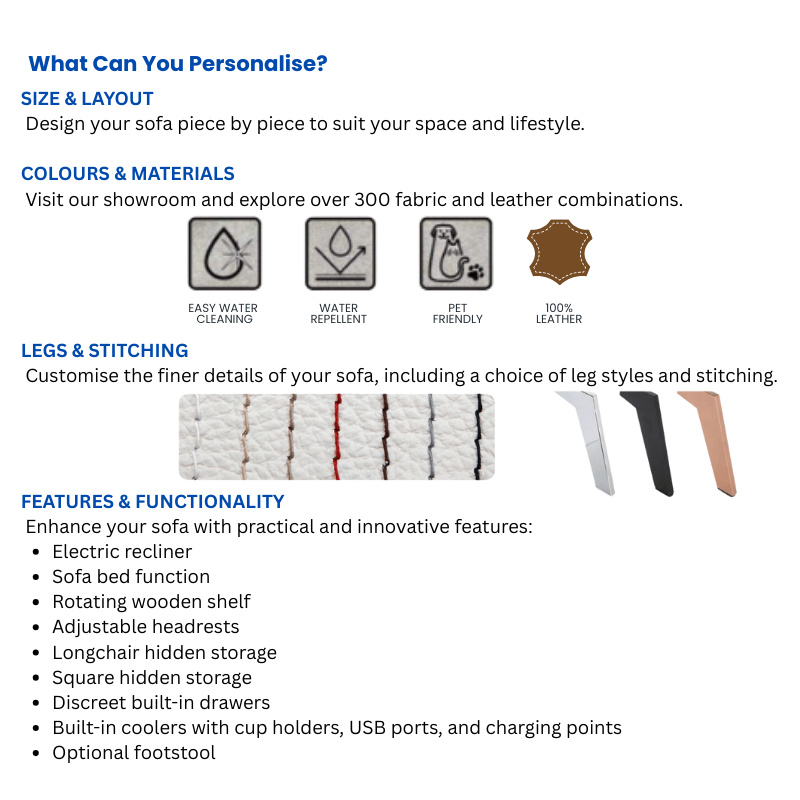 Choose from over 300 colour combinations in premium fabrics and leathers, offering exceptional design flexibility: