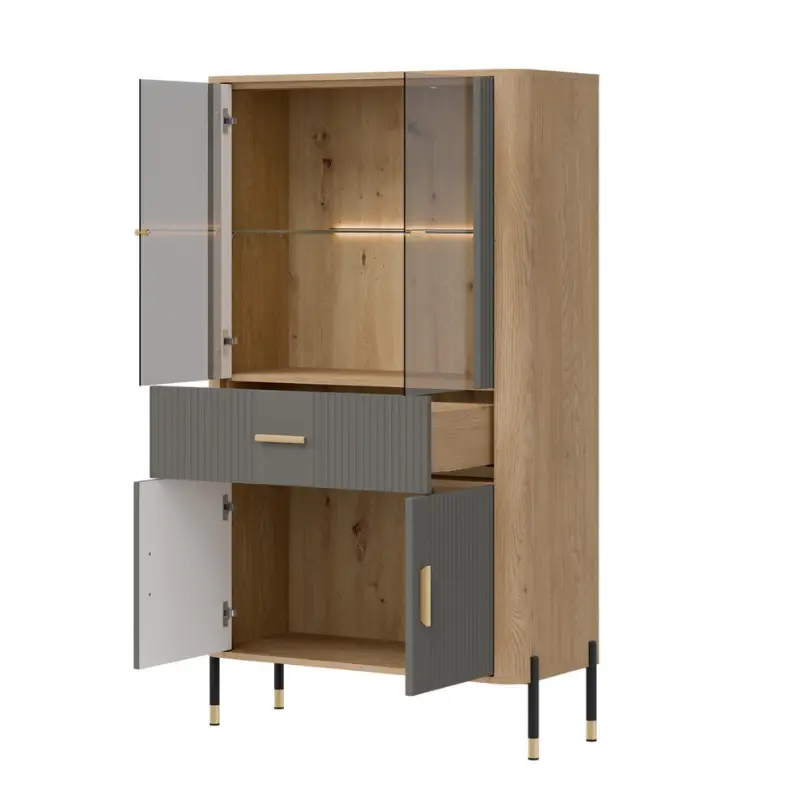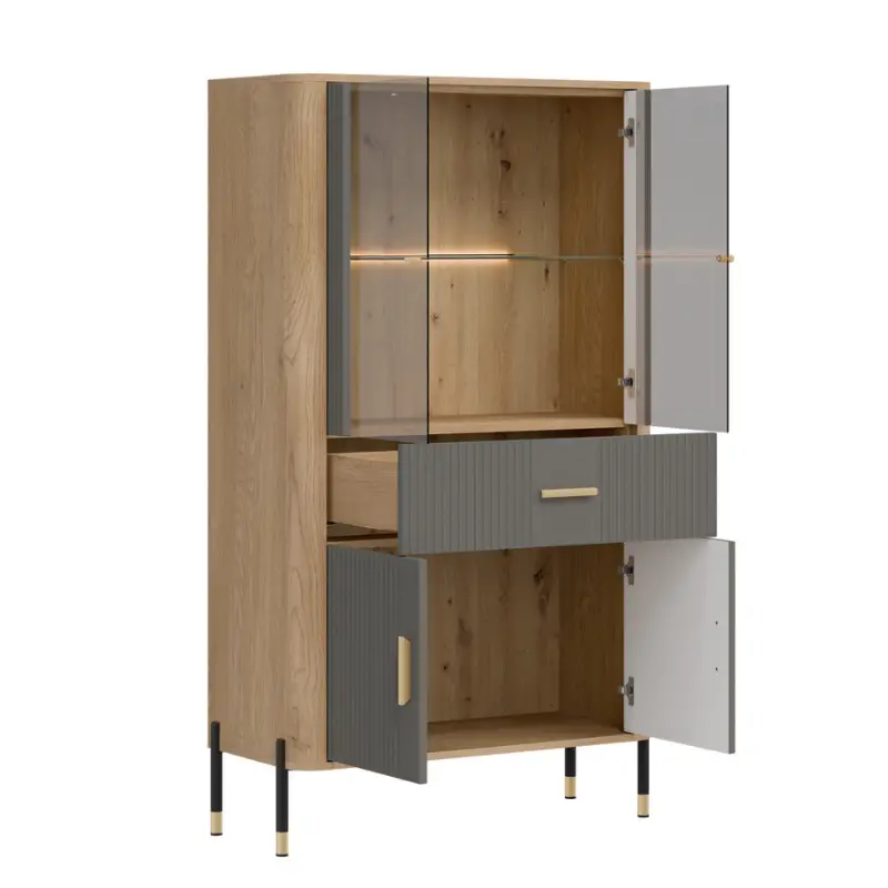 Subtle gold and black accents, seen in the slender handles and refined leg finishes, add a touch of luxury without overpowering the clean, minimalist design. These elegant details elevate the overall look, making Dante an eye-catching yet timeless display cabinet for modern interiors.