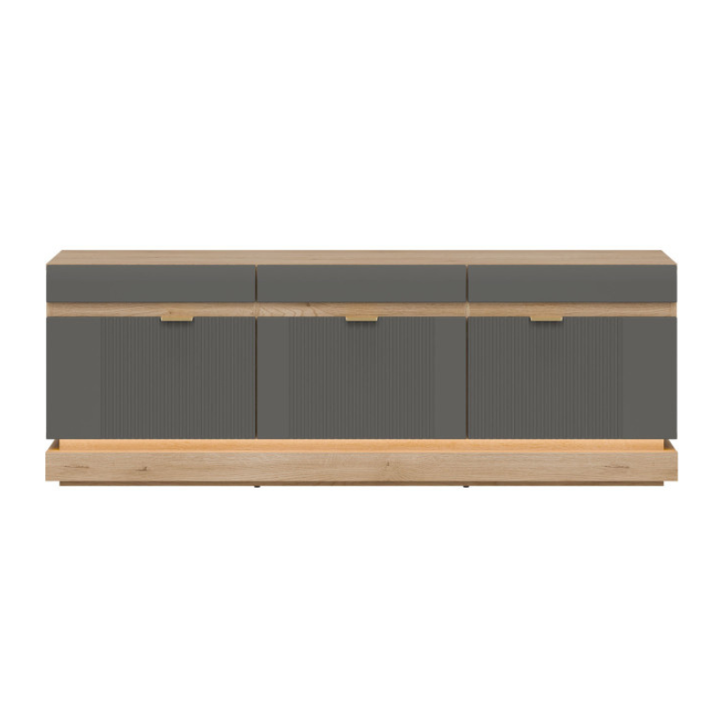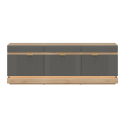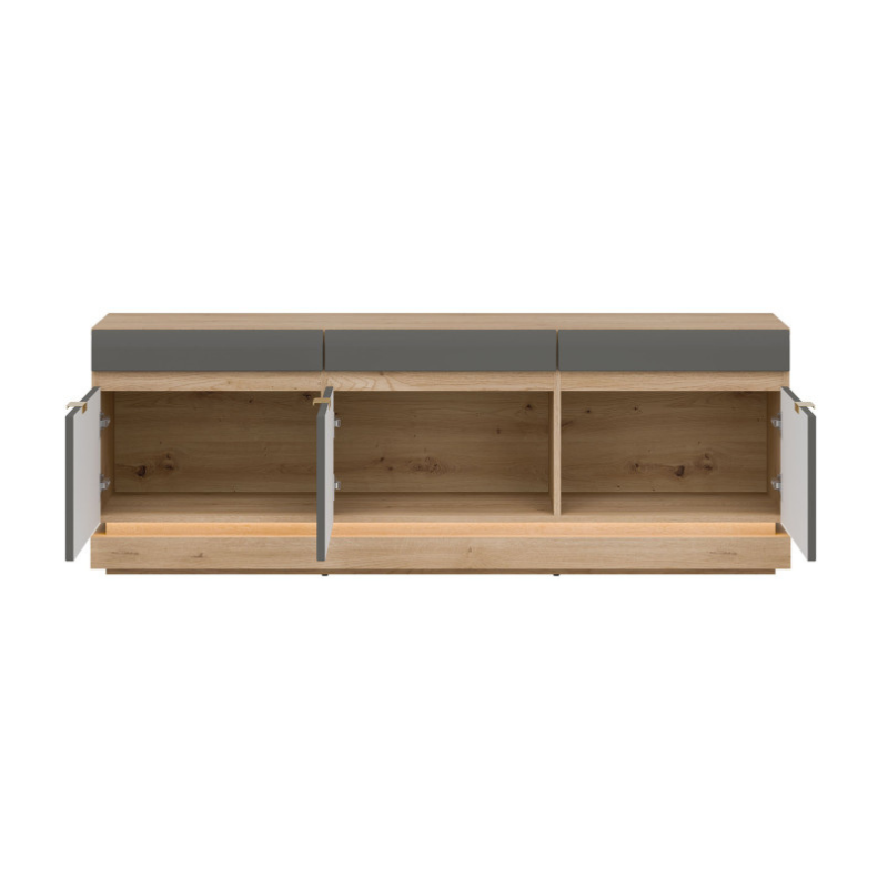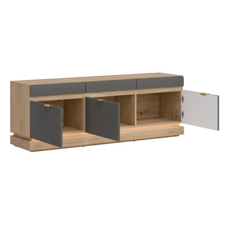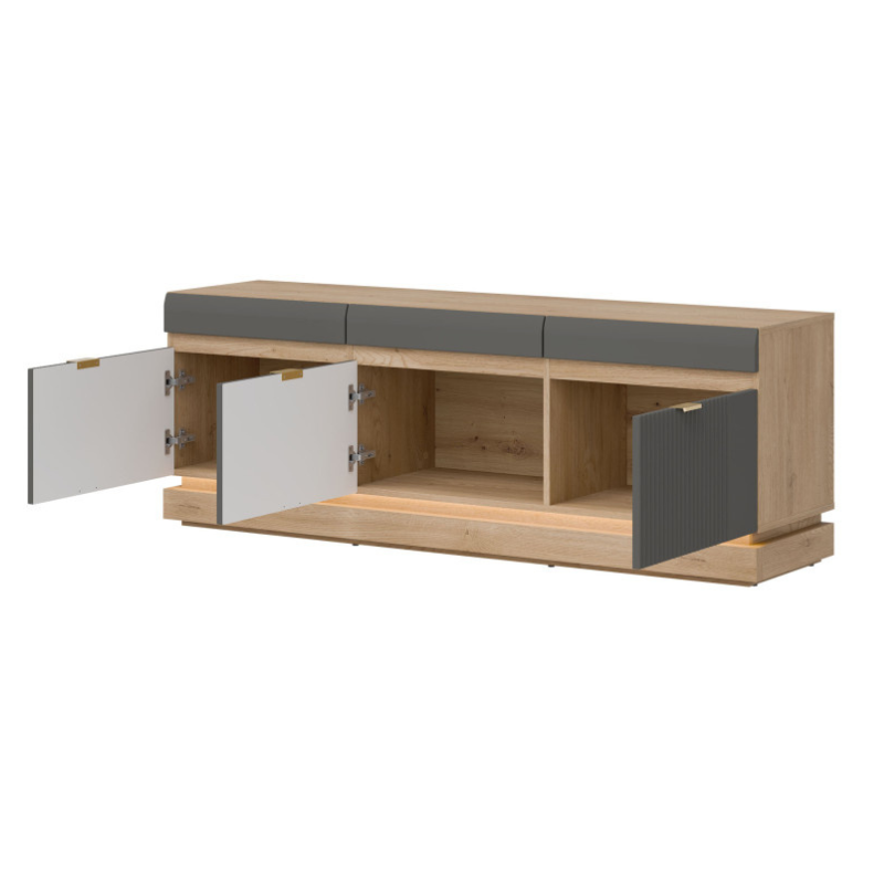 Available in a range of stylish colour options, from soft, light shades to rich, deep tones, the Milton TV unit adapts effortlessly to different interior styles. Gold aluminium handles add a touch of luxury, while the natural wood-effect finish introduces warmth and balance, creating a harmonious and modern composition for your living space.