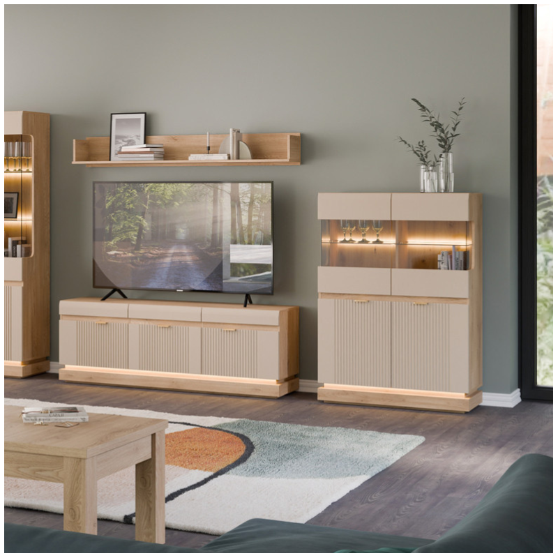 The Milton Low Display Cabinet in Cashmere and Oak from the Milton collection is a refined blend of modern design and timeless elegance. Designed for stylish contemporary homes, this premium display cabinet features MDF fronts with a fashionable matte finish, enhanced by subtle vertical milling that adds depth and sophistication to the design.