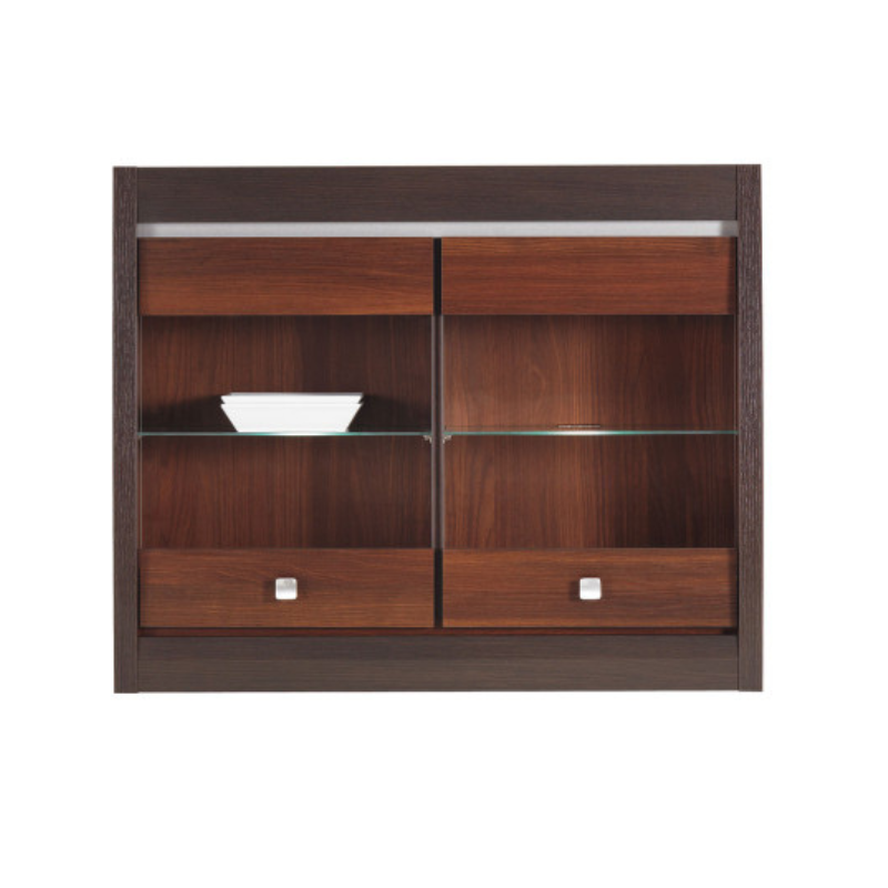 This wall shelf cabinet in Ireland stands out with decorative silver trim, rounded sides, and metal handles featuring an engraved floral pattern. The high-quality finish ensures your interior looks stylish and well-organised, whether used in the living room, dining space, or kitchen.