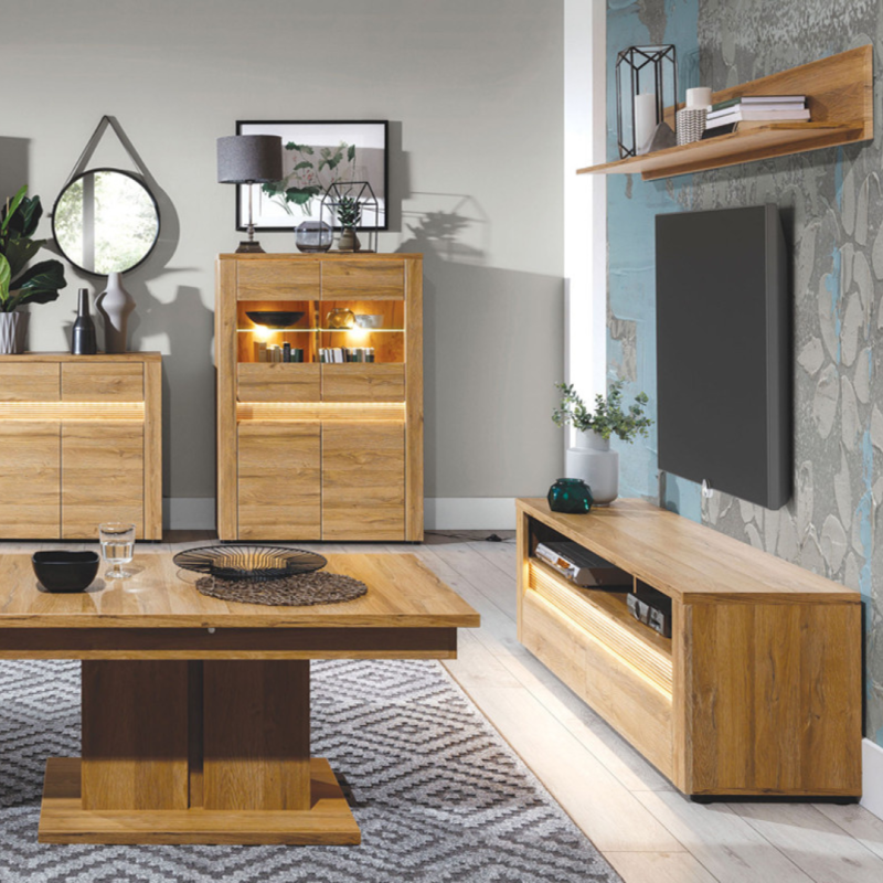 Bring modern style and smart organization to your living room with the elegant Sandy TV Unit. Designed for contemporary homes, this stylish TV unit with storage combines practicality with eye-catching design. Featuring a warm oak-effect body finish (Kolorystyka korpusu) with contrasting black details and integrated LED lighting, it is a perfect choice for customers searching for premium TV units Ireland homes love.