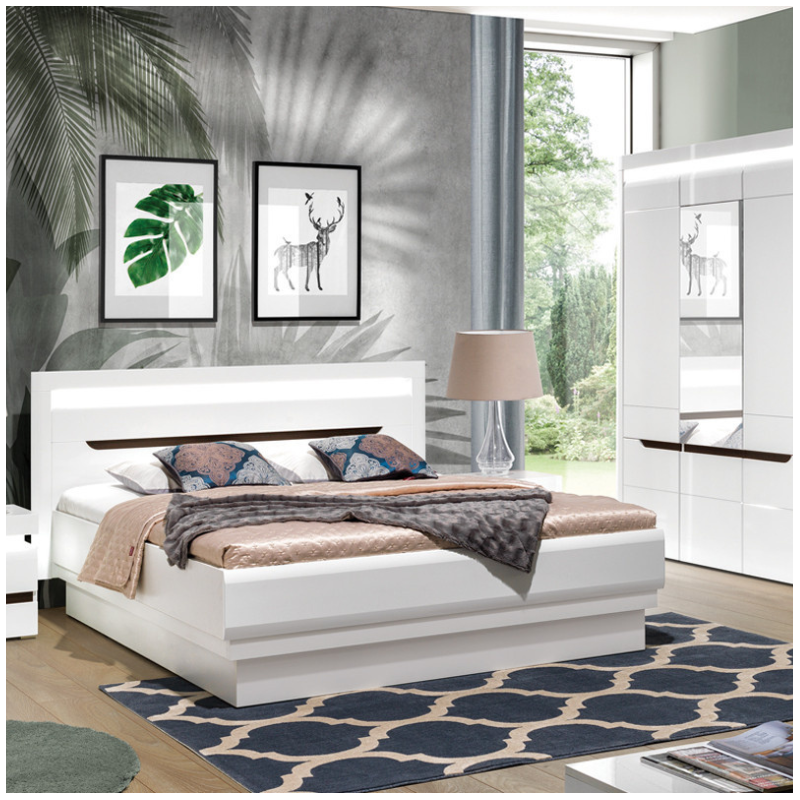 The Irma bed features a solid frame and a decorative headboard that becomes a stylish focal point in your bedroom. The unique blend of matte and high-gloss white fits current interior trends and adds brightness and charm to any space.