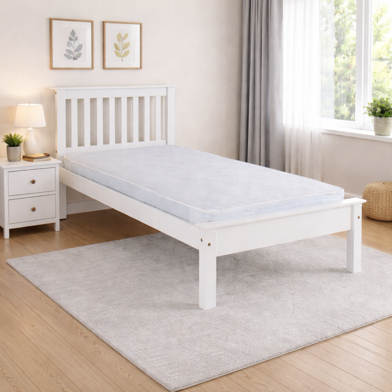 Crafted to a standard single bed size, the Monaco Single Bed 3Ft Classic Low Foot End White provides generous sleeping space while remaining ideal for smaller bedrooms. Its solid construction ensures long-lasting support and comfort, making it suitable for daily use in children’s rooms, guest bedrooms, or spare rooms.