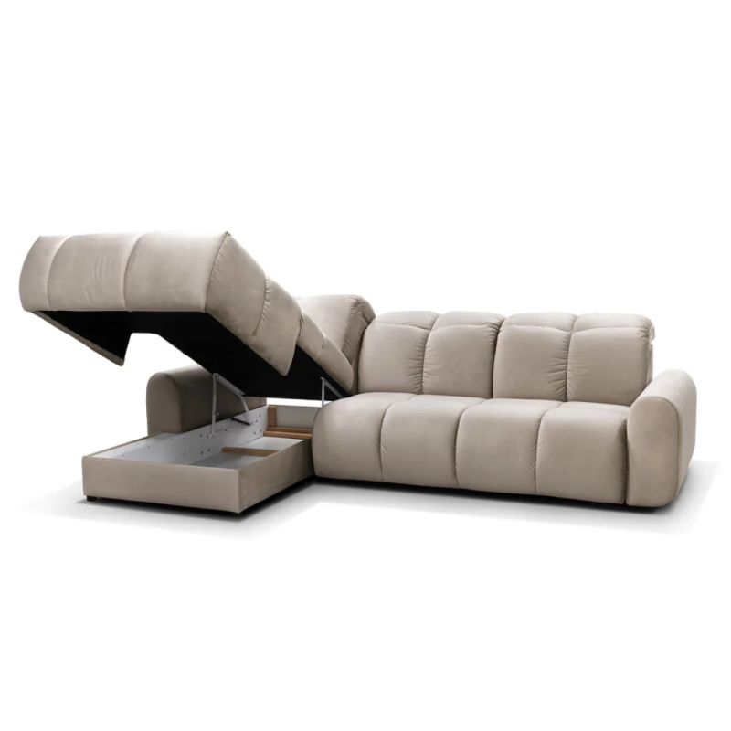 This modern corner sofa bed features a smooth sleeping function and a spacious bedding storage compartment, making it perfect as a comfortable sofa bed for everyday use or as a convenient guest bed.
