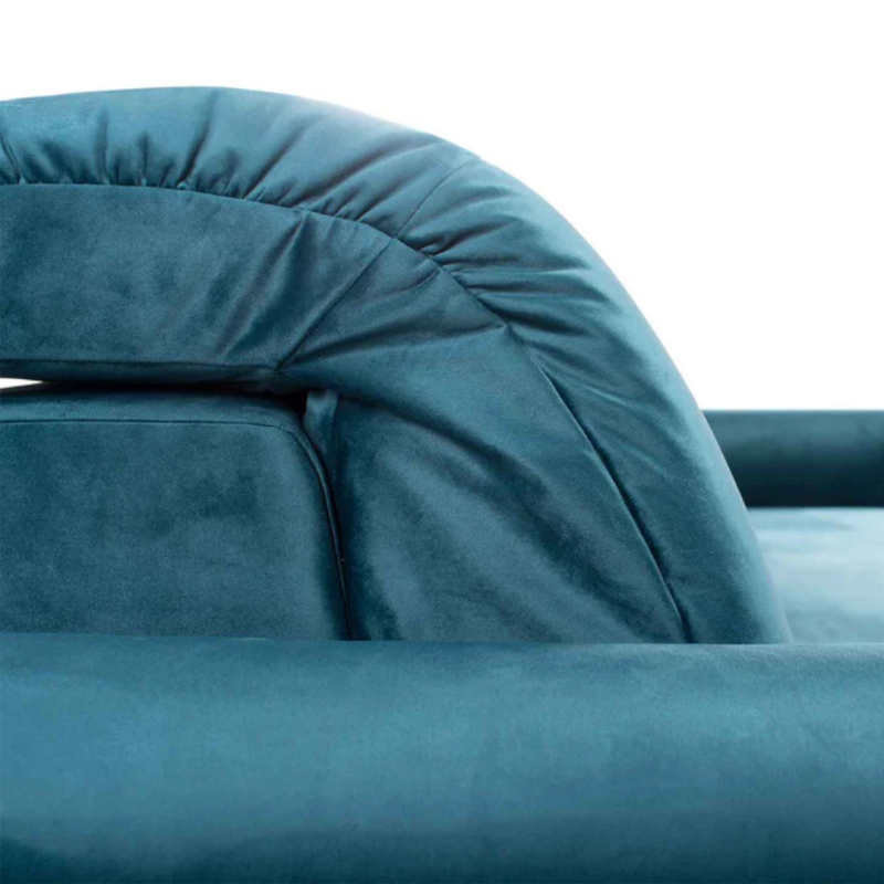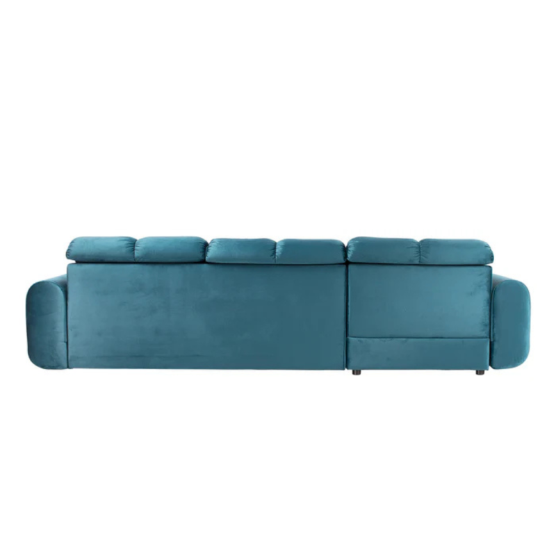 This fully upholstered corner sofa bed can be placed anywhere in your living space, including the center of the room. Its modern design and luxurious emerald upholstery make it ideal for contemporary homes, apartments, and designer interiors.