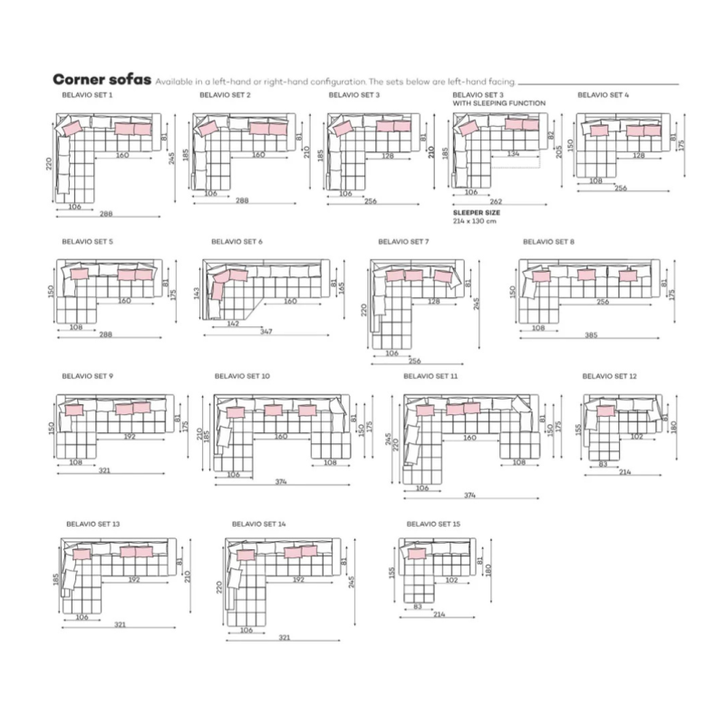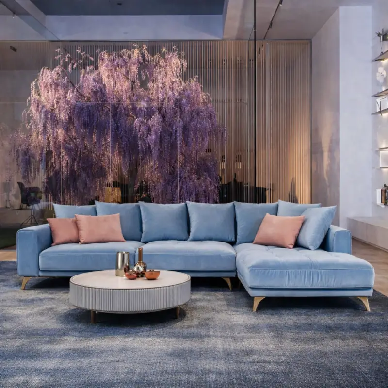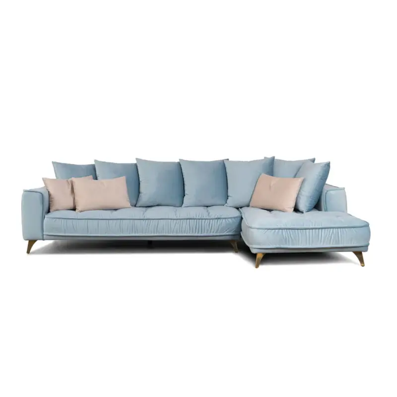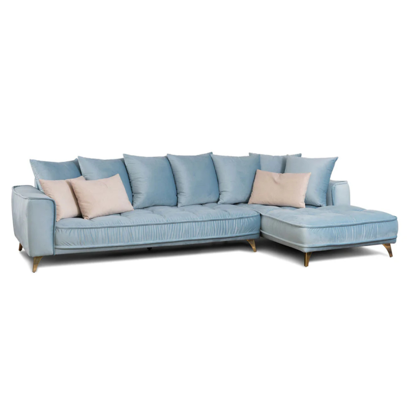 The Belavio blue corner sofa is available in various configurations, fabrics, and finishes, allowing you to create a sofa tailored to your space and style.