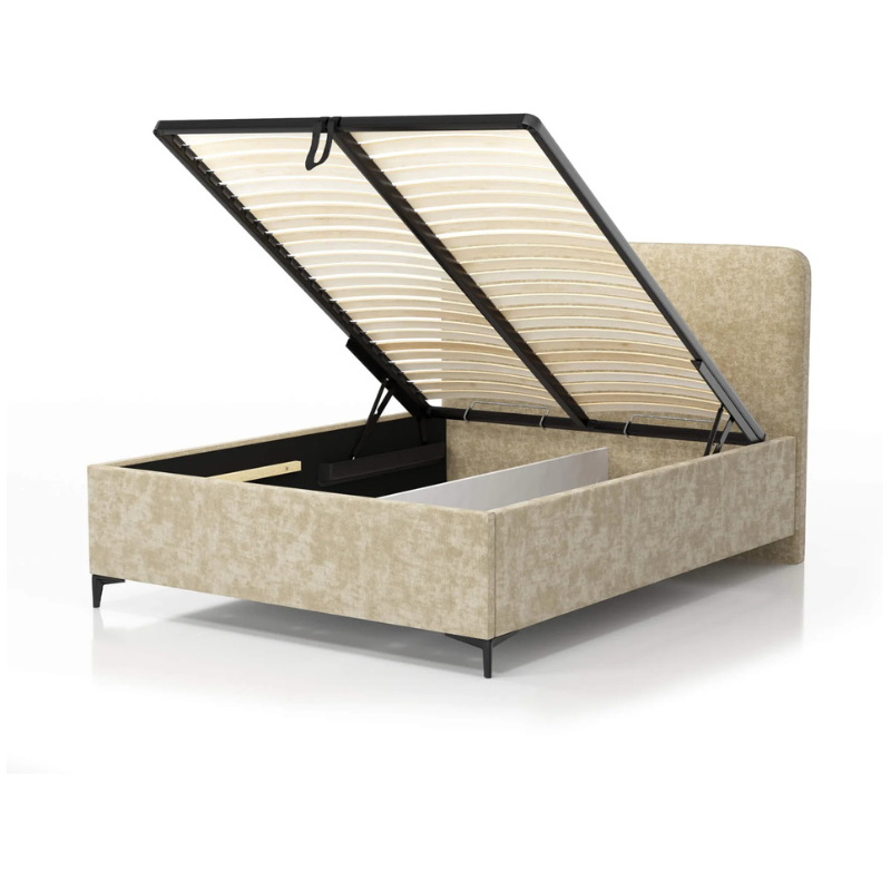 The sturdy metal frame includes 48 flexible bent birch slats for optimal mattress support and long-lasting durability. The gas-lift mechanism allows effortless opening and closing of the storage compartment. The bed is compatible with 12 cm legs, allowing you to personalise the final look.
