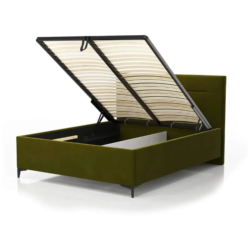 The sturdy metal frame includes 48 flexible bent birch slats for optimal mattress support and long-lasting durability. The gas-lift mechanism allows effortless opening and closing of the storage compartment. The bed is compatible with 12 cm legs, allowing you to personalise the final look.