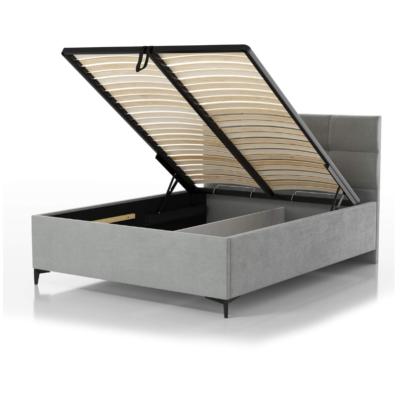 The sturdy metal frame includes 48 flexible bent birch slats for optimal mattress support and long-lasting durability. The gas-lift mechanism allows effortless opening and closing of the storage compartment. The bed is compatible with 12 cm legs, allowing you to personalise the final look.