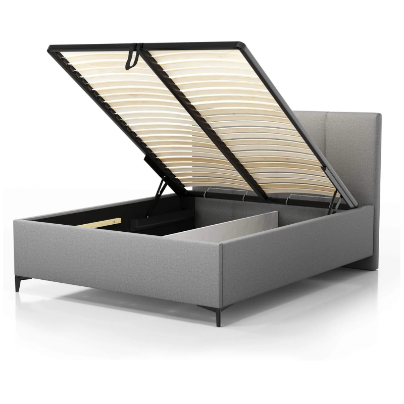 The sturdy metal frame includes 48 flexible bent birch slats for optimal mattress support and long-lasting durability. The gas-lift mechanism allows effortless opening and closing of the storage compartment. The bed is compatible with 12 cm legs, allowing you to personalise the final look.