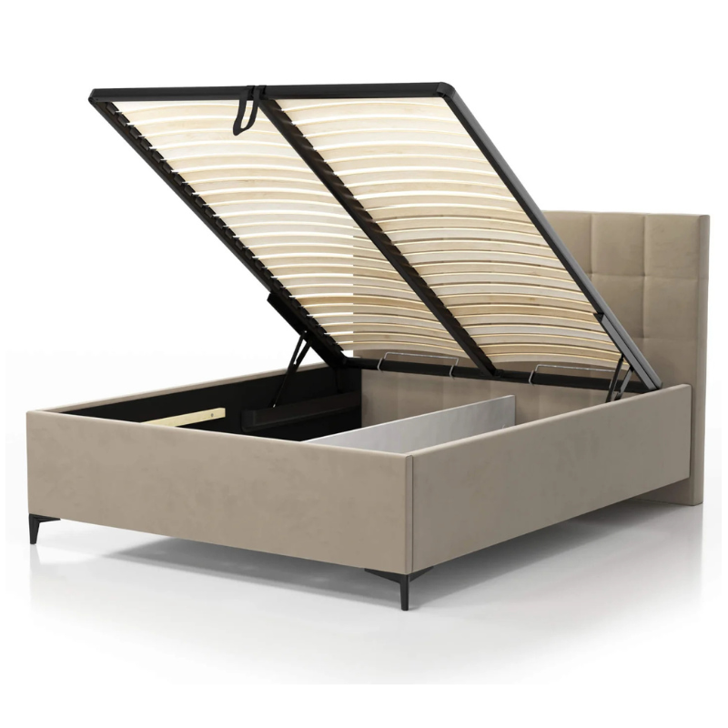 The sturdy metal frame includes 48 flexible bent birch slats for optimal mattress support and long-lasting durability. The gas-lift mechanism allows effortless opening and closing of the storage compartment. The bed is compatible with 12 cm legs, allowing you to personalise the final look.