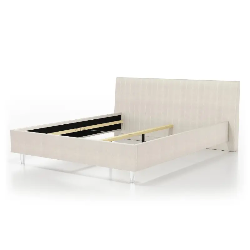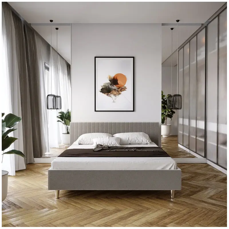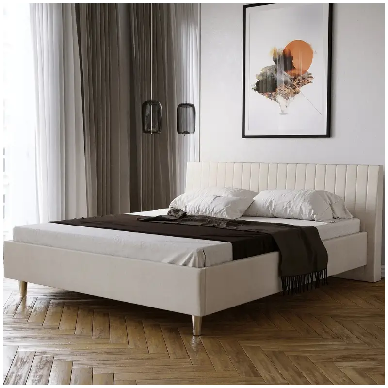 The Upholstered Bed Frame 65 is a modern, custom-designed bed that combines minimalist elegance with distinctive detailing. Its simple frame and high headboard with eye-catching diagonal stitching create a unique composition, making it ideal for both classic and contemporary bedrooms.