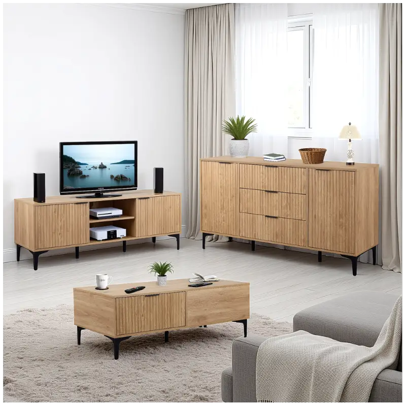 Perfect for modern homes, apartments, and newly furnished spaces, this modern TV unit offers both strong visual appeal and practical everyday storage. The spacious top surface comfortably supports most flat-screen TVs, while two large doors provide concealed storage for media devices, gaming consoles, cables, and accessories — helping maintain a clean and organised entertainment area.