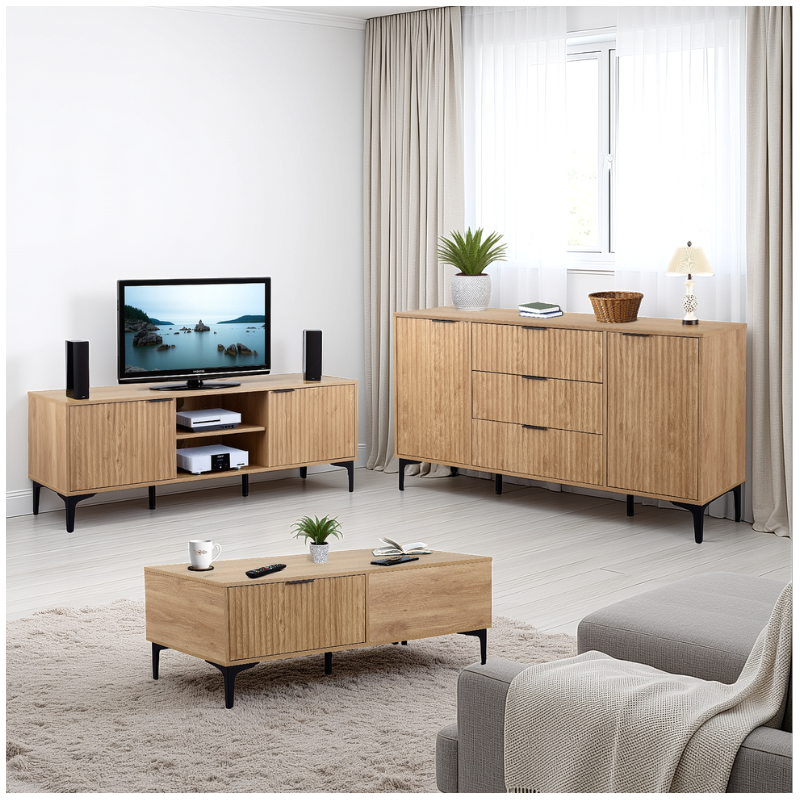 Perfect for modern homes, apartments, and newly furnished spaces, this modern TV unit offers both strong visual appeal and practical everyday storage. The spacious top surface comfortably supports most flat-screen TVs, while two large doors provide concealed storage for media devices, gaming consoles, cables, and accessories — helping maintain a clean and organised entertainment area.