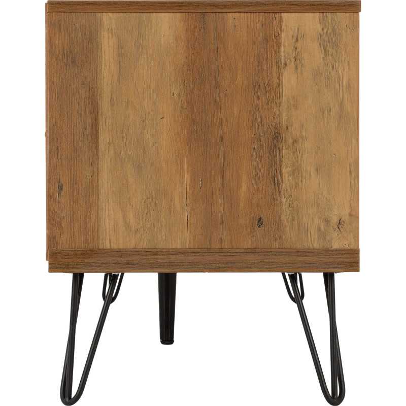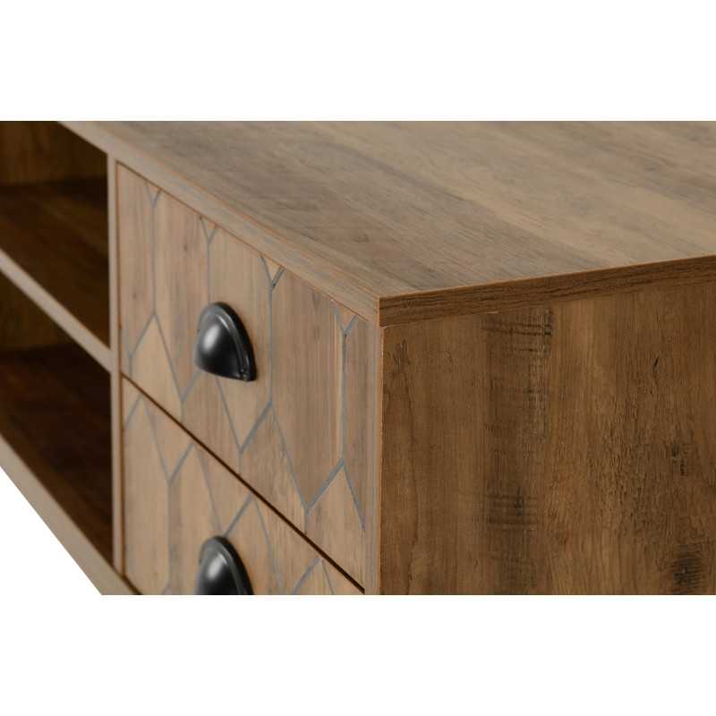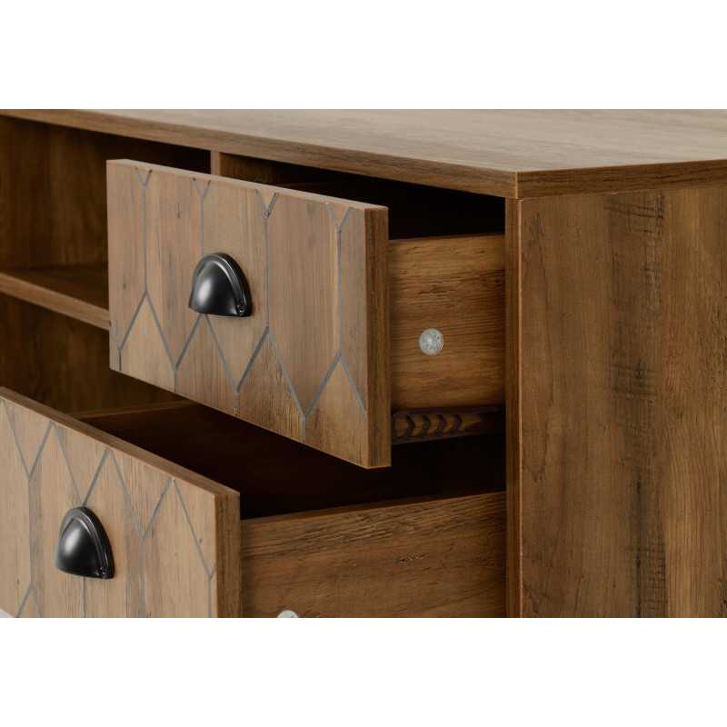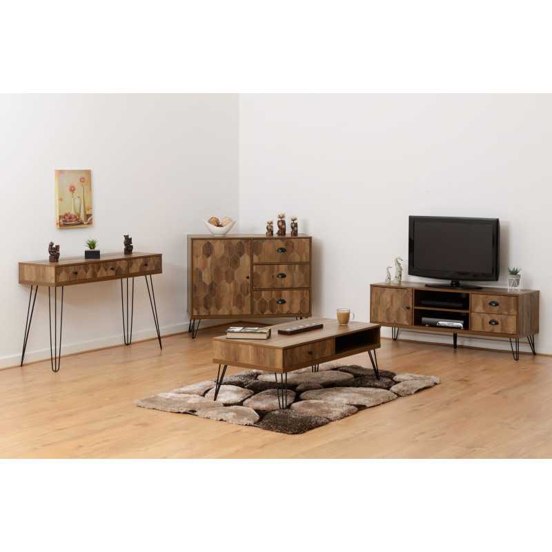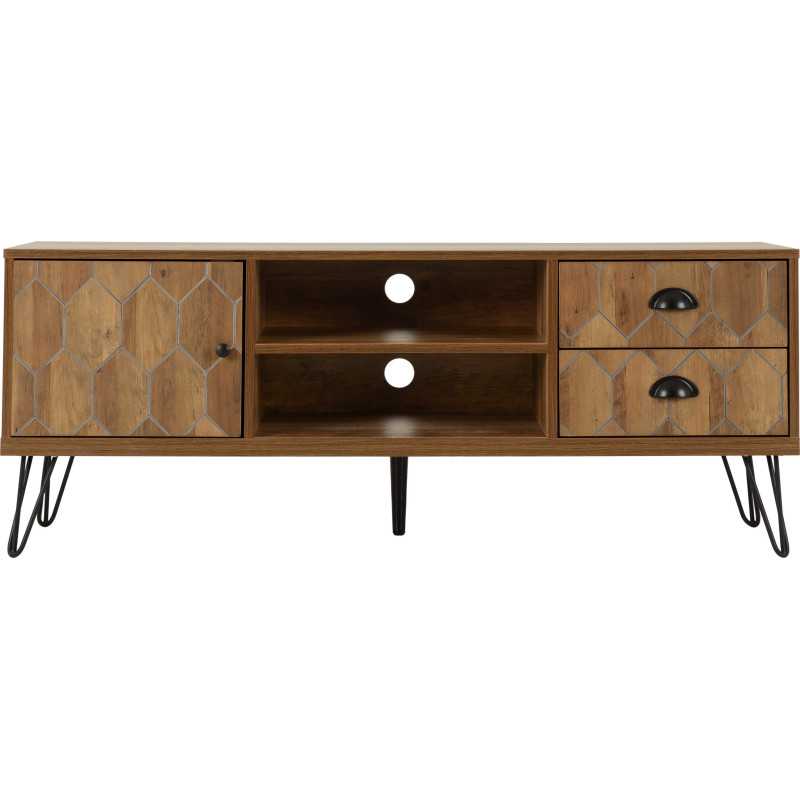 The Ottawa 1 Door 2 Drawer TV Unit in Medium Oak Effect and Black is a stylish and functional TV console designed to elevate modern living spaces. Combining mid-century inspiration with contemporary industrial detailing, this eye-catching TV media unit features geometric patterned fronts, sleek black metal accents, and elegant hairpin-style legs — making it a standout TV unit for today’s interiors.