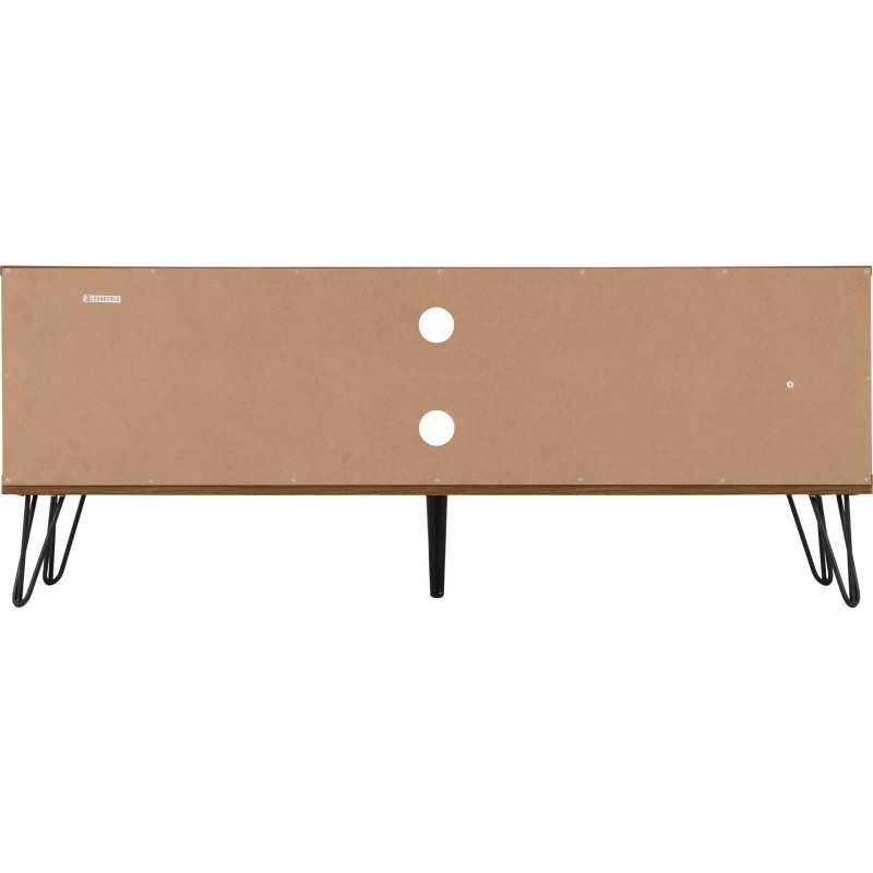 The warm oak-effect finish adds natural texture and character, while the contrasting black handles and metal legs create a bold, modern look. Whether styled in a contemporary apartment or a family home, this versatile TV console table delivers both visual impact and practical storage for your entertainment setup.
