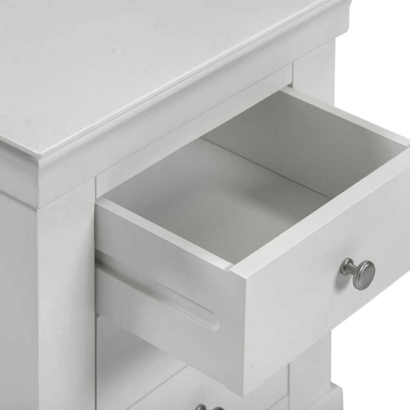 The soft pebble grey painted finish adds warmth and versatility, allowing this 3 drawer bedside cabinet to complement both contemporary and classic interiors. Whether styled alongside an upholstered bed or a wooden frame, the Bordeaux bedside unit enhances your bedroom with refined character.