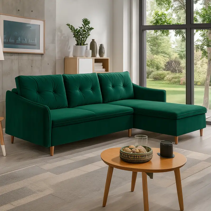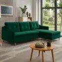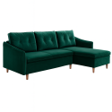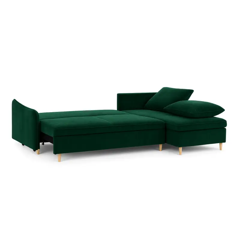The Rocco Corner Sofa Bed in green velvet blends classic warmth with modern elegance. Its stately yet homely profile makes it the perfect addition to a refined living space. The chic, shallow armrests and button-studded, delicately shaped pillows enhance its sophisticated design.