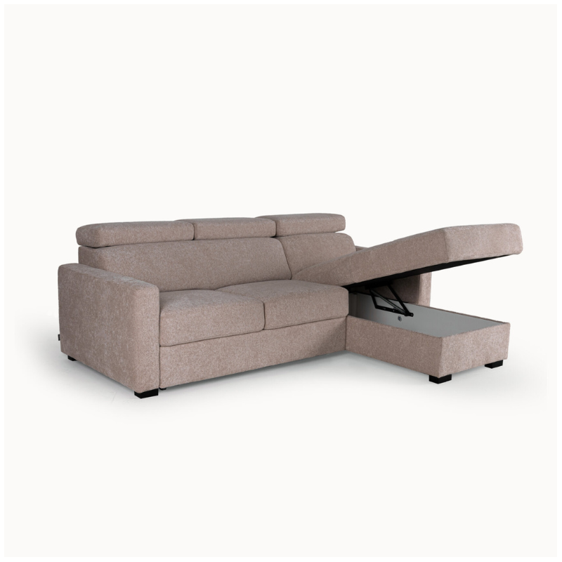 This corner sofa bed includes a large hidden storage compartment beneath the seat. It is perfect for storing bedding, cushions, blankets, or everyday items.