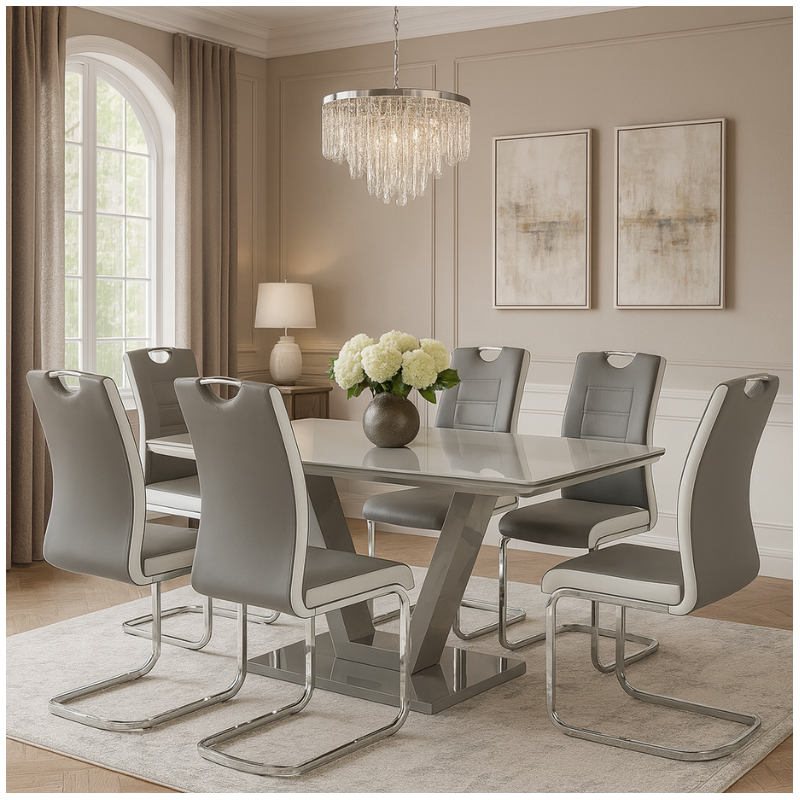 This two tone dining chair blends modern comfort with elegant style. Upholstered in a dual-fabric finish and supported by a polished chrome cantilever frame, it’s the perfect addition to contemporary dining rooms and kitchens.