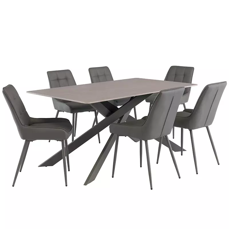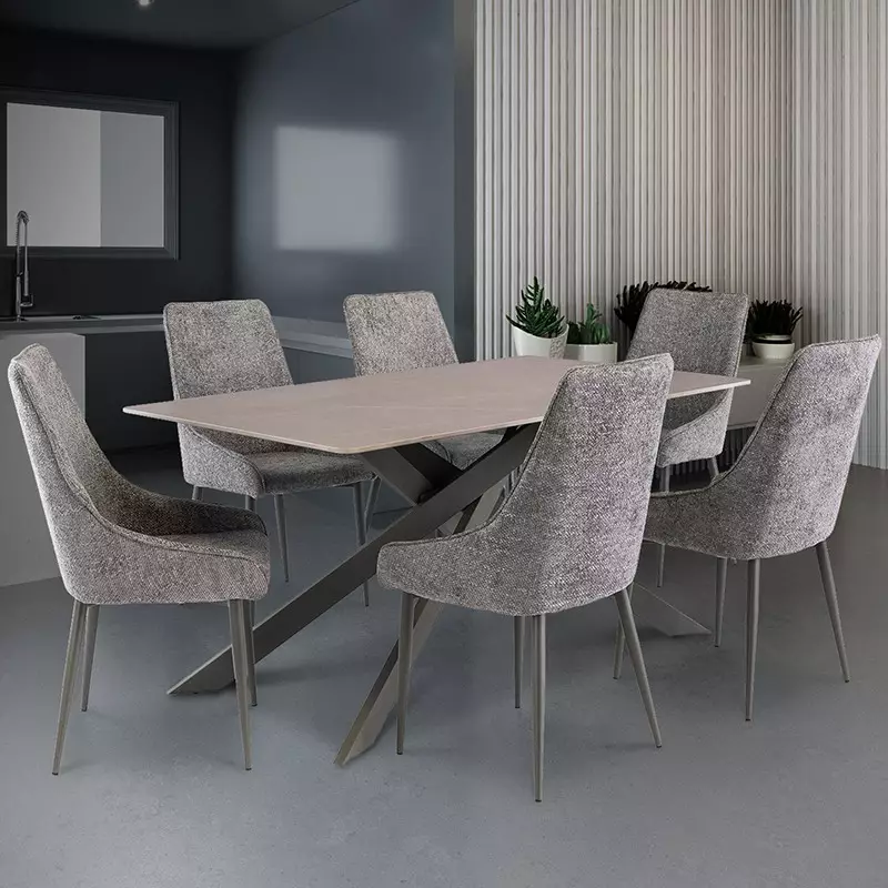 Experience the perfect blend of modern design and durability with the Camilla Matt Grey Sintered Stone Dining Table. This expertly crafted dining table features a sophisticated matt grey sintered stone top paired with a bold X-shaped black powder-coated base. A true statement piece, this luxury dining table combines elegance with urban sophistication, comfortably seating up to 6 people. Pair it effortlessly with our curated collection of premium dining chairs to complete your dining space.